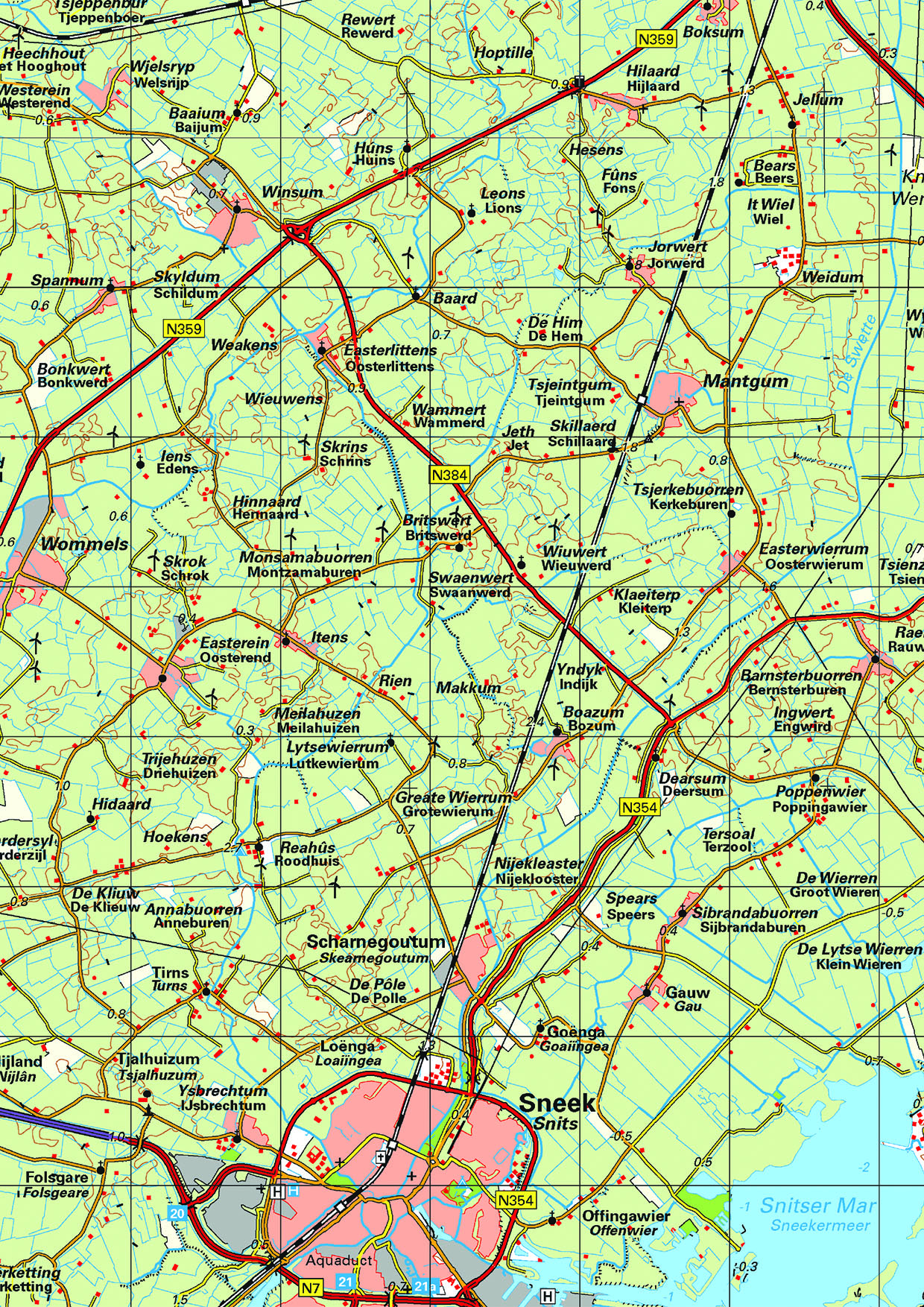 Provinciekaart van Friesland waarop alle steden, dorpen en grotere gehuchten, wegen en wateren duidelijk zijn afgebeeld. De kaart bevat informatie zeer veel topografische informatie. Zo zijn bijvoorbeeld alle boerderijen, begraafplaatsen en windmolens afgebeeld. Van alle andere provincies zijn deze kaarten ook verkrijgbaar. Ook leverbaar zonder masker.