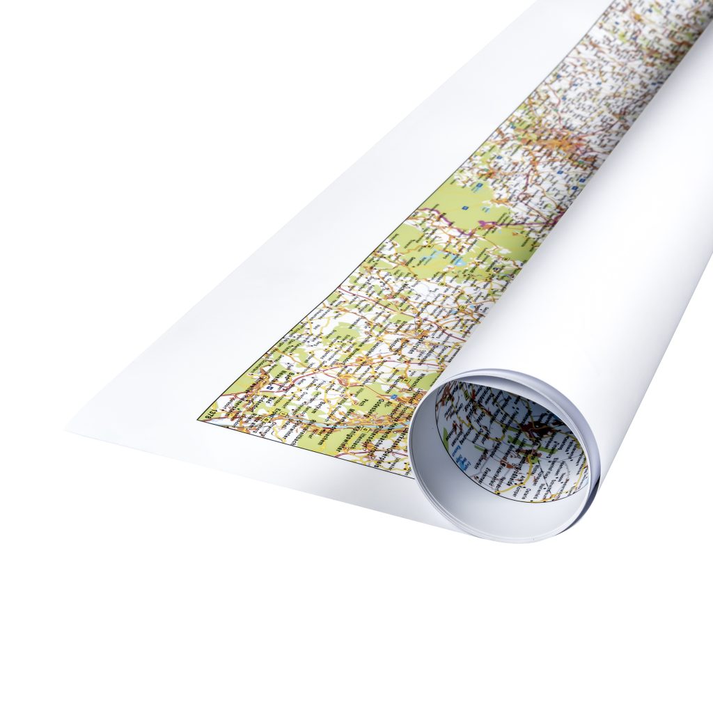 Deze uitvoering wordt gedrukt op dik papier (200 gr) dat gecoat is met een laagje zijdeglans. Het materiaal voelt stevig aan en oogt net niet mat maar is zeker niet glanzend. Aan de onder- en bovenkant van de kaart kunnen ook zwarte plastic strips worden aangebracht. Dit zijn robuuste klikstrips. De bovenste strip kan worden voorzien van 2 ophangoogjes en een wit ophangkoord dat meegeleverd wordt.