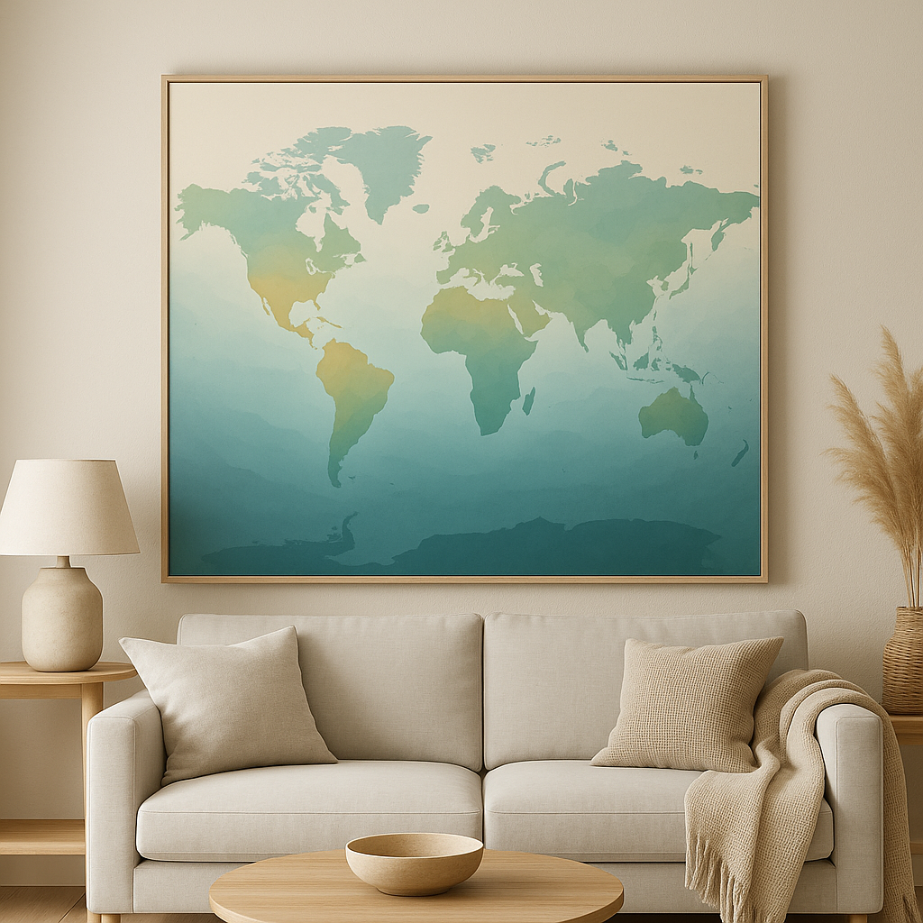 Deze wereldkaart toont de aarde in een eigentijdse cartografische kunststijl, waarin vorm, kleur en balans centraal staan. De continenten zijn natuurgetrouw weergegeven, maar zonder landsgrenzen, plaatsnamen of andere aanduidingen. Door het gebruik van zachte kleurverlopen en een harmonieus palet ontstaat een rustig en samenhangend beeld. De kaart combineert geografische herkenbaarheid met een abstracte uitstraling en is daardoor zowel informatief als decoratief. Het ontwerp is bewust tijdloos gehouden en past goed in moderne interieurs waar verfijning en eenvoud samenkomen. De kaart nodigt uit tot kijken, zonder visuele drukte of overbodige details.