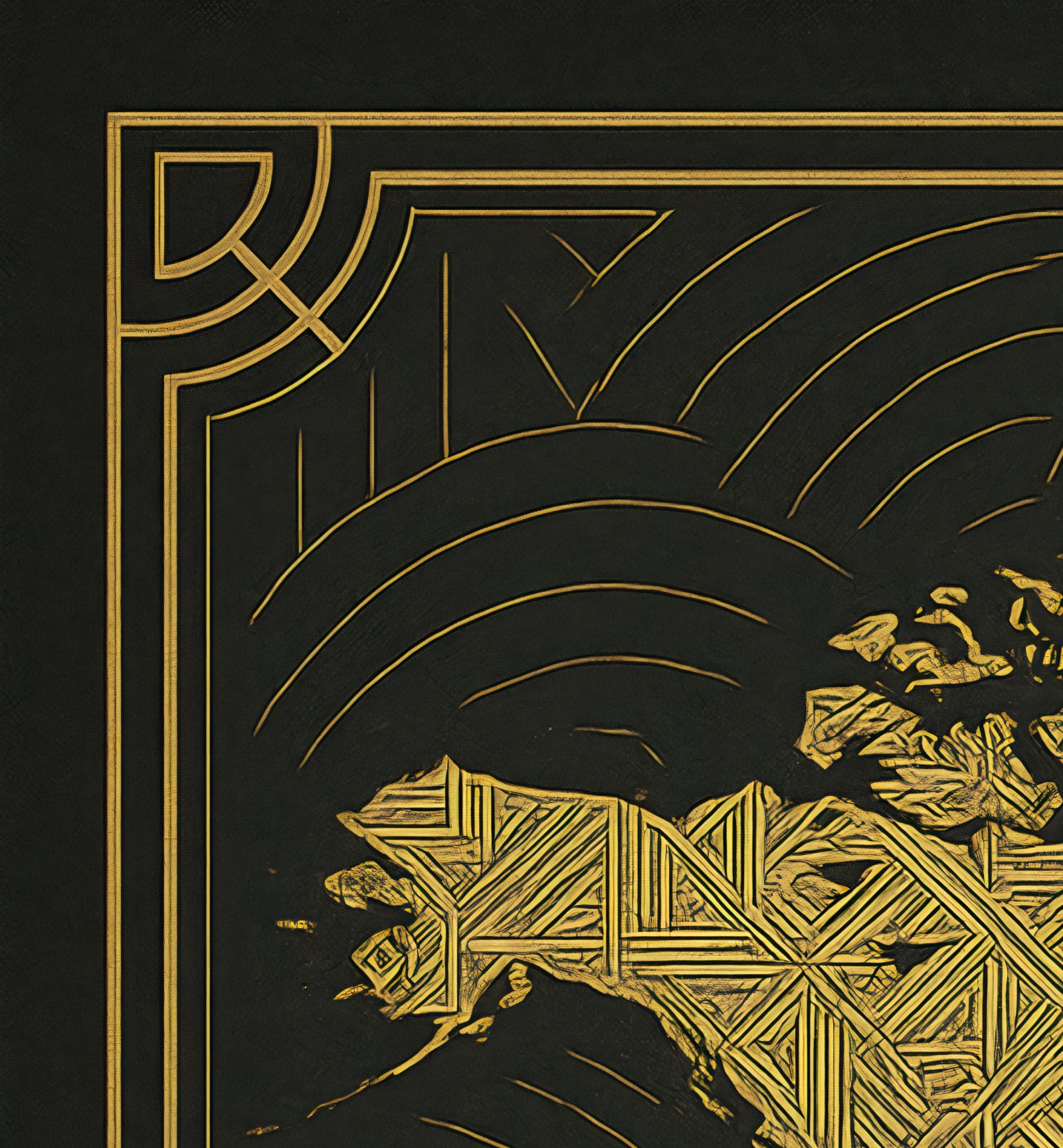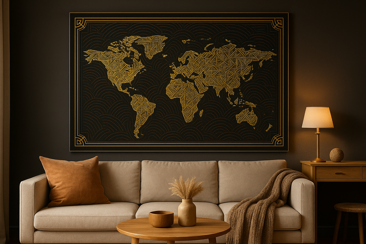 Deze art deco wereldkaart toont de aarde in een krachtig contrast van diep zwart en goudkleurige geometrie. De continenten zijn opgebouwd uit strakke, herhalende patronen die typerend zijn voor de art deco-stijl en geven de kaart een luxe en grafisch karakter. Door het gebruik van AI ontstaan subtiele variaties in lijnvoering en structuur, waardoor de kaart bewust afwijkt van exacte cartografie. De golvende patronen in de oceanen en de decoratieve rand versterken het ritme en de symmetrie van het geheel. Het resultaat is een uitgesproken artistieke interpretatie van de wereld, ontworpen als visueel statement.