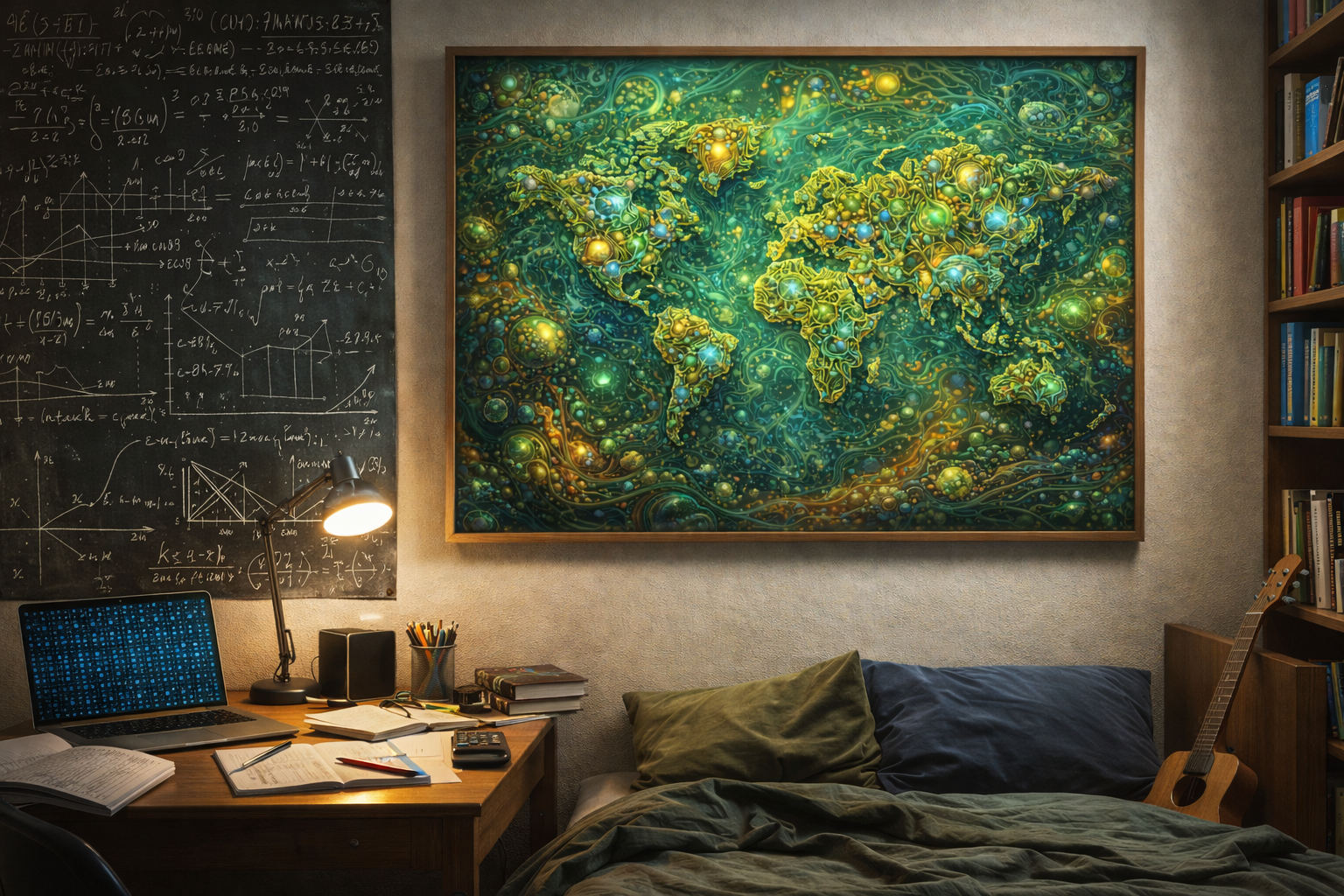 Deze biopunk wereldkaart verbeeldt de aarde als een abstract netwerk van groeiende structuren en lichtgevende verbindingen. De continenten lossen deels op in organische vormen, waarin knooppunten, stromingen en patronen belangrijker zijn dan vaste grenzen. Door het gebruik van AI ontstaan vloeiende overgangen en onregelmatige details die de kaart bewust laten afwijken van traditionele cartografie. De wereld wordt hier niet gepresenteerd als vaste vorm, maar als samenhangend systeem van beweging en energie. Het resultaat is een artistieke interpretatie waarin logica en intuïtie samenkomen in een visuele structuur die blijft veranderen naarmate je langer kijkt.