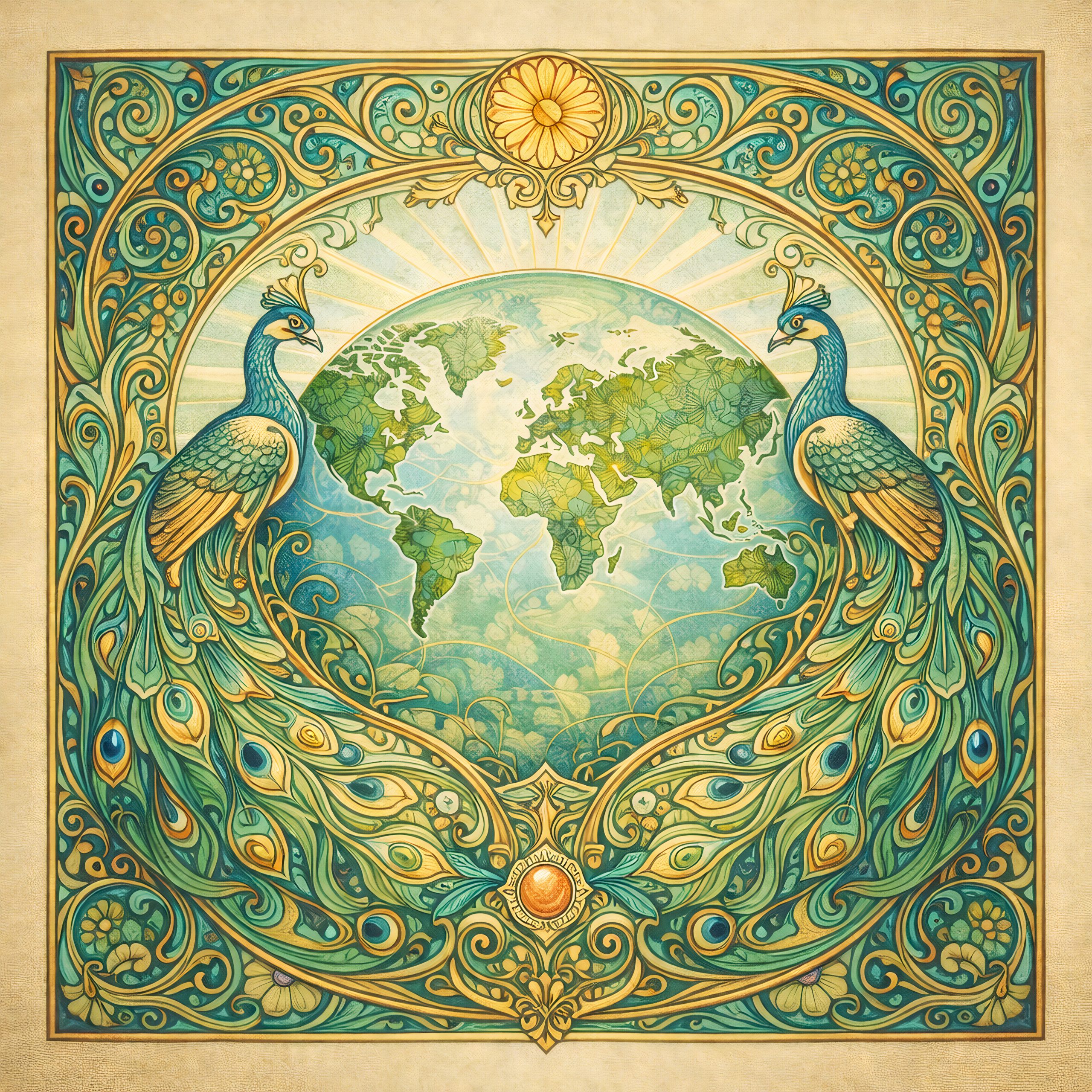 Deze art nouveau wereldkaart verbeeldt de aarde als een harmonieus samenspel van vorm, beweging en symmetrie. In plaats van bloemmotieven is de kaart omlijst met sierlijke pauwen en golvende lijnen, een klassiek thema binnen de art nouveau-stijl. De continenten zijn opgebouwd uit organische patronen en zachte kleurovergangen in groen, blauw en goud. Door het gebruik van AI ontstaan subtiele variaties in detail en structuur, waardoor de kaart bewust afwijkt van exacte cartografie. Het resultaat is een artistieke wereldkaart waarin ritme en decoratie centraal staan, en de wereld wordt gepresenteerd als een visueel en bijna muzikaal geheel.