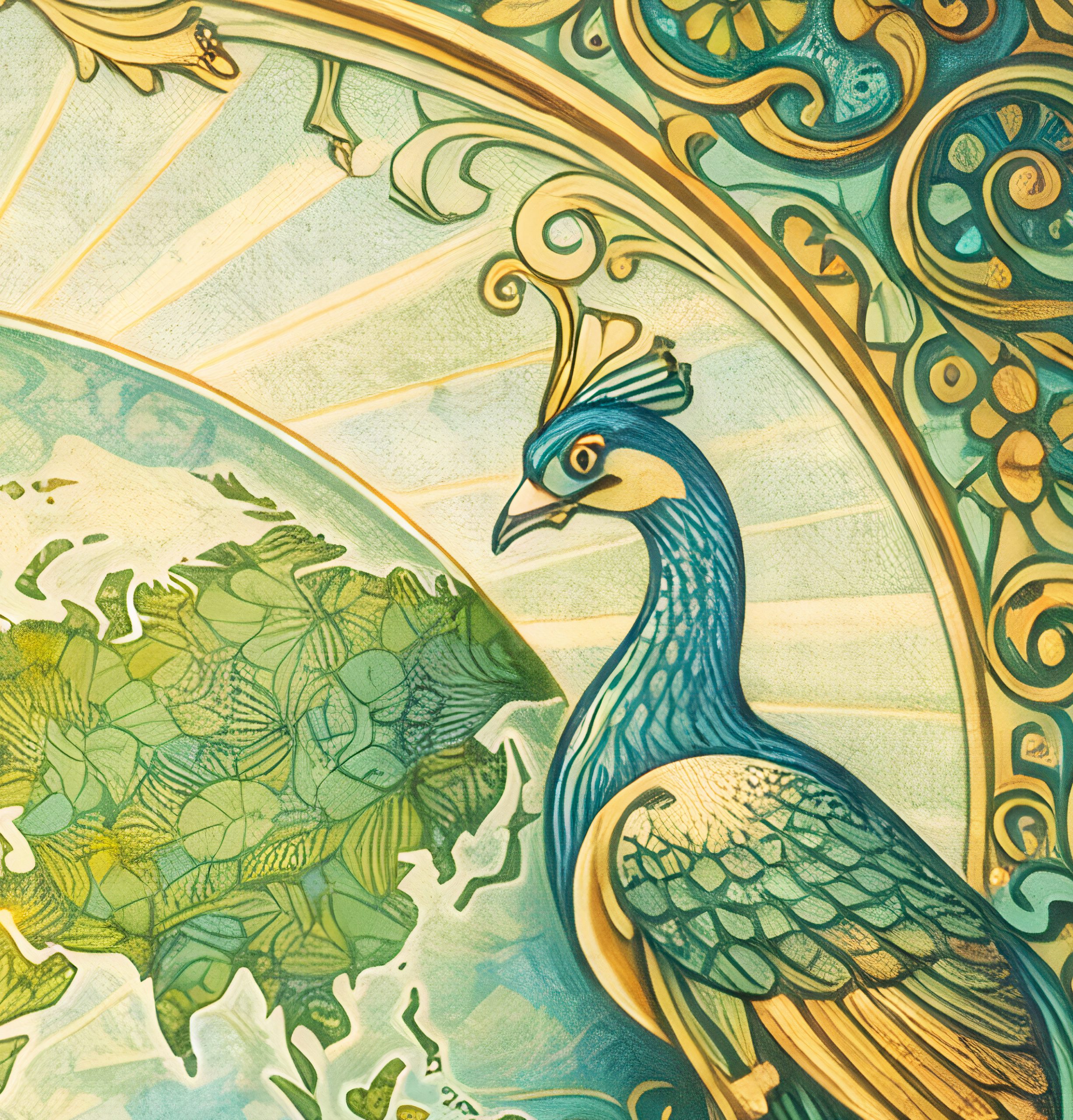 • Art nouveau wereldkaart met pauwenmotief