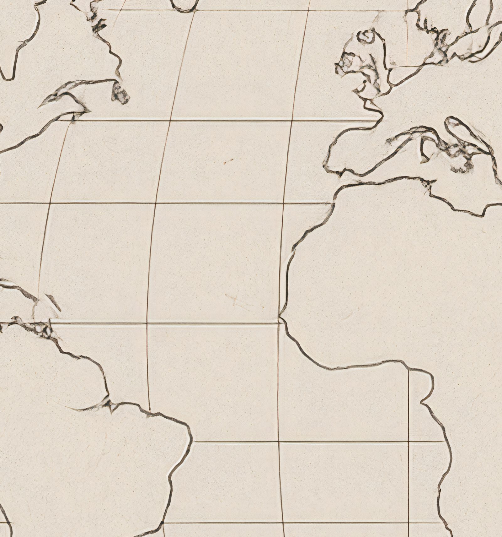 Deze wereldkaart is uitgevoerd in een pen-and-ink illustratieve stijl, geïnspireerd op handgetekende atlasillustraties en reisjournalen. Het lijnwerk is vloeiend en licht, met minimale arcering en een natuurlijke variatie in lijnsterkte. Daardoor ontstaat een open en toegankelijke kaart waarin vorm en beweging centraal staan. De continenten zijn herkenbaar en zorgvuldig getekend, zonder tekst of aanvullende symbolen. Het geheel ademt een verkennend karakter, alsof de kaart direct met pen op papier is vastgelegd tijdens een reis. Deze stijl combineert cartografische herkenbaarheid met een persoonlijke, illustratieve uitstraling.