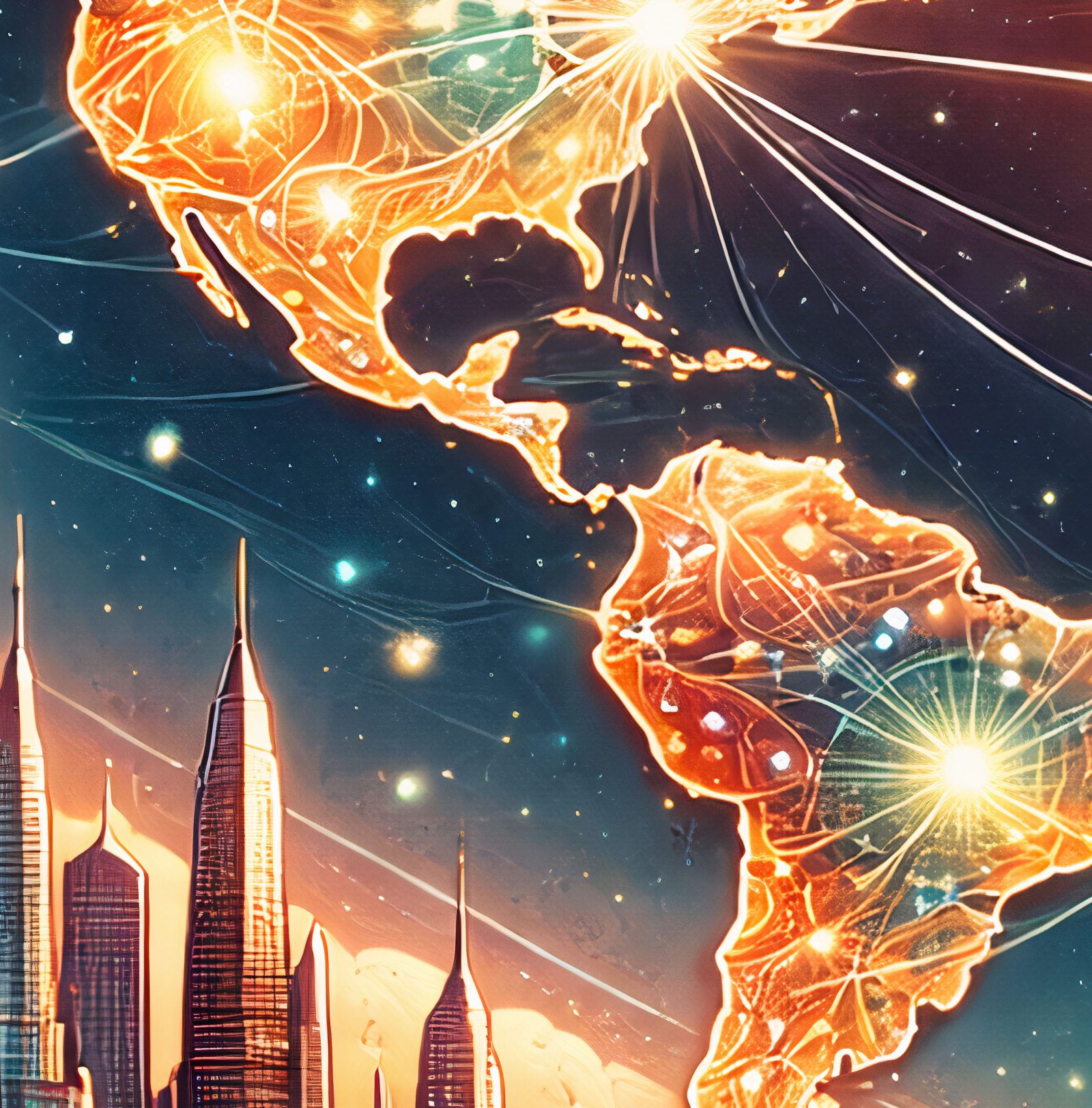 Deze futuristische retro wereldkaart combineert het optimisme van vroege toekomstvisies met een uitgesproken grafische stijl. De continenten lichten op in warme neonkleuren en zijn verbonden door stralende lijnen die doen denken aan netwerken, reizen en vooruitgang. De wereld wordt hier niet weergegeven als geografisch feit, maar als toekomstbeeld waarin technologie en verbeelding samenkomen. Door het gebruik van AI ontstaan subtiele variaties in vorm en structuur, waardoor de kaart bewust afwijkt van klassieke cartografie. Het resultaat is een dynamische interpretatie van de wereld, geïnspireerd op retrofuturisme en visionaire ontwerpen uit het verleden.