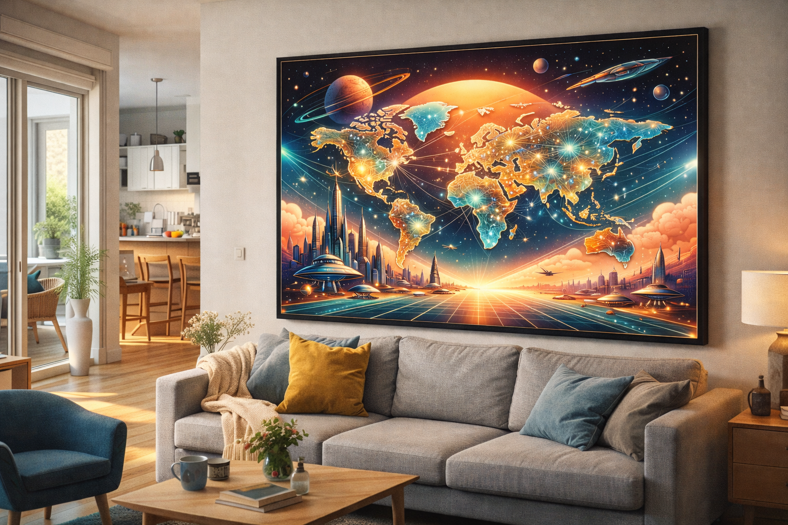 Deze futuristische retro wereldkaart combineert het optimisme van vroege toekomstvisies met een uitgesproken grafische stijl. De continenten lichten op in warme neonkleuren en zijn verbonden door stralende lijnen die doen denken aan netwerken, reizen en vooruitgang. De wereld wordt hier niet weergegeven als geografisch feit, maar als toekomstbeeld waarin technologie en verbeelding samenkomen. Door het gebruik van AI ontstaan subtiele variaties in vorm en structuur, waardoor de kaart bewust afwijkt van klassieke cartografie. Het resultaat is een dynamische interpretatie van de wereld, geïnspireerd op retrofuturisme en visionaire ontwerpen uit het verleden.