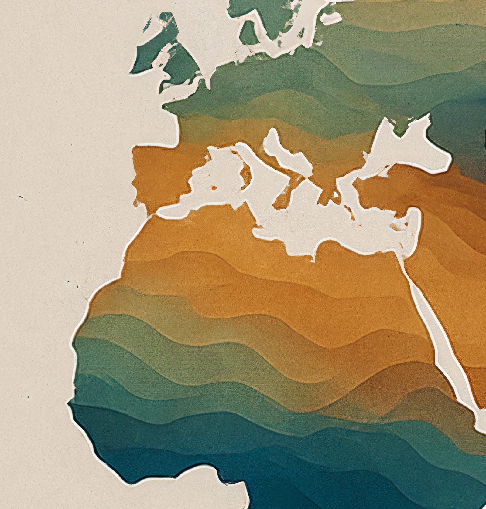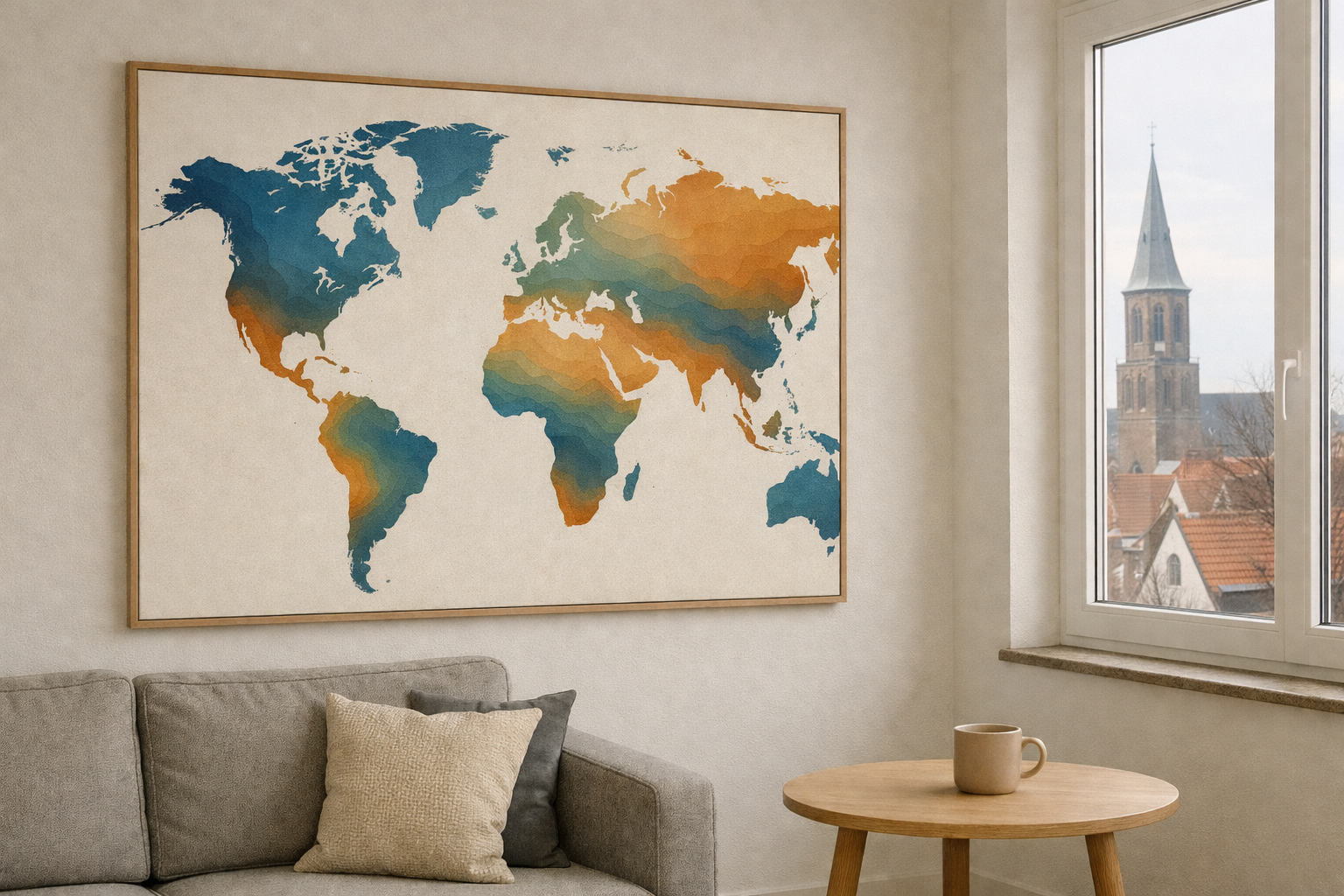 Deze wereldkaart is ontworpen als expressieve cartografische kunst, waarbij kleur en gelaagde vormen samen het beeld bepalen. De continenten zijn duidelijk herkenbaar, maar zonder grenzen, namen of symbolen. Door het gebruik van vloeiende kleurbanen ontstaat een gevoel van diepte en beweging, terwijl het totaalbeeld rustig en in balans blijft. De combinatie van warme aardetinten en koelere blauwen zorgt voor contrast zonder hard te worden. Deze kaart legt de nadruk op de natuurlijke samenhang van de wereld en is bedoeld als decoratief, informatief object dat blijft boeien zonder visuele drukte.