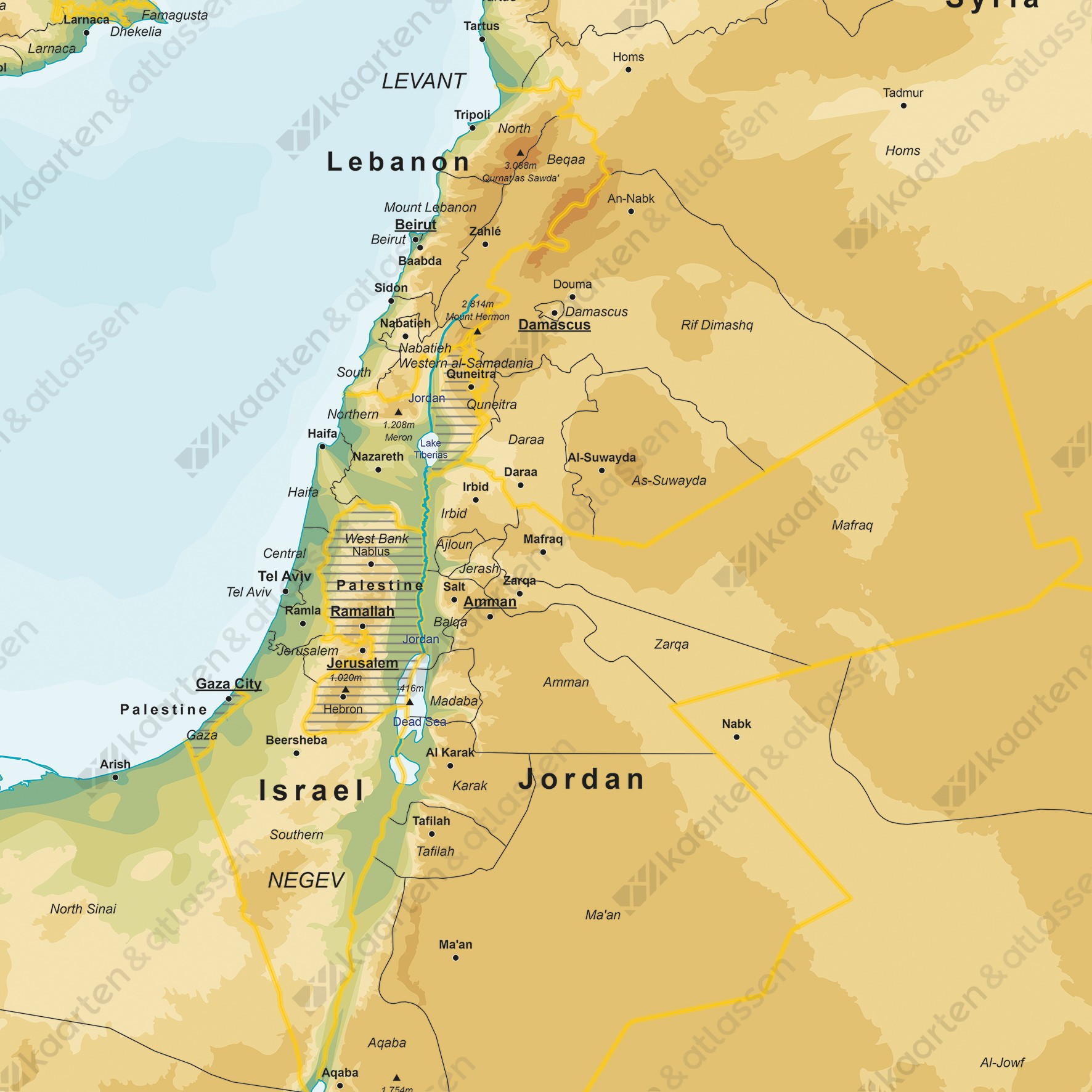 Een duidelijke natuurkundige kaart van het Midden Oosten en dan met name van Israël en omliggende landen. De kaart is uitgevoerd in een prachtige kleurencombinatie, heeft een eigentijdse uitstraling en is Engelstalig.