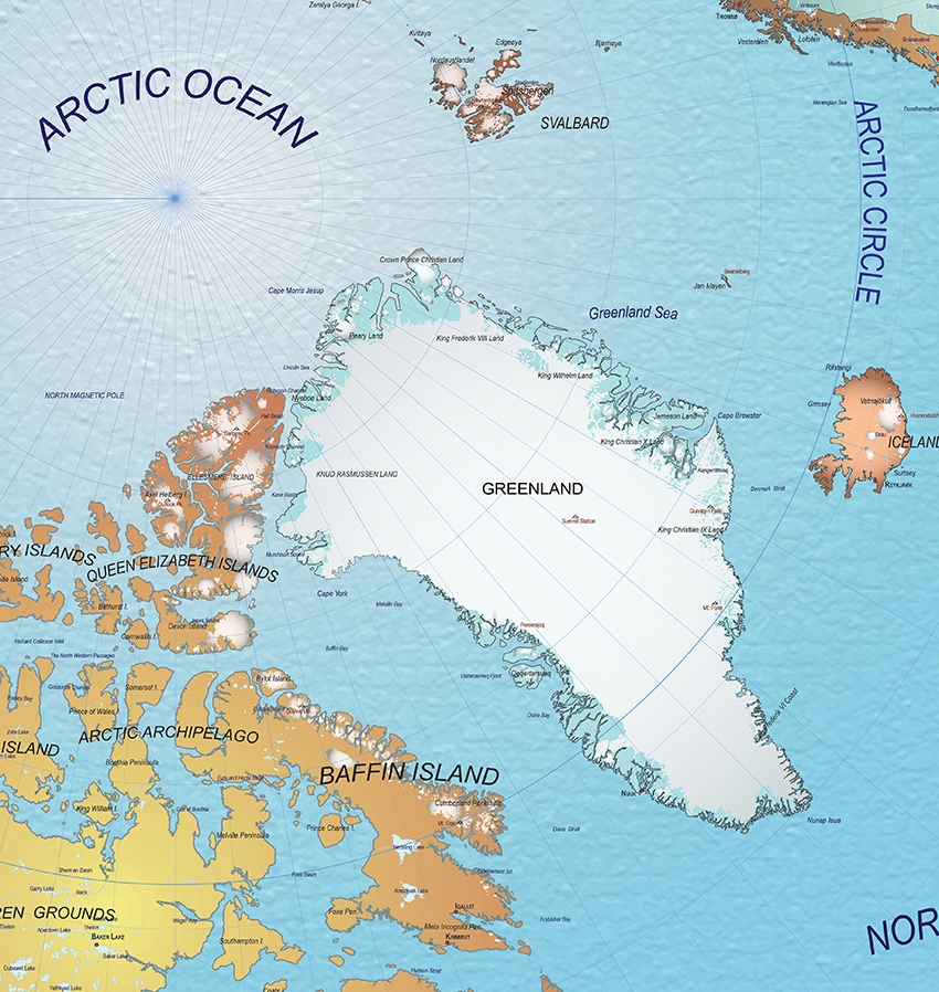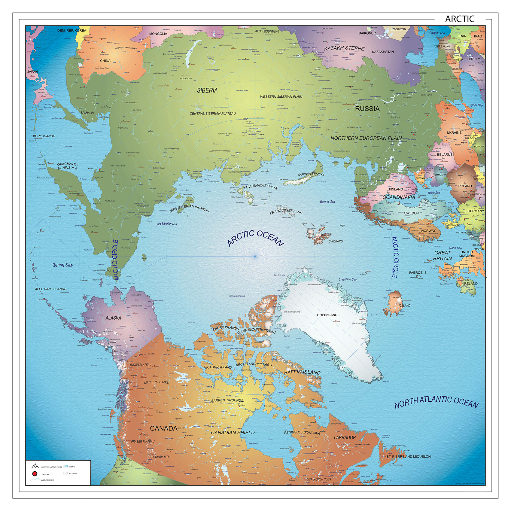 Deze wandkaart van het Noordpoolgebied geeft een helder overzicht van de regio rond de Noordelijke IJszee. De ligging van Groenland komt duidelijk naar voren, centraal tussen Noord-Amerika en Europa. Zeeën, kustlijnen en ijsgebieden zijn overzichtelijk weergegeven. De kaart laat zien waarom dit gebied strategisch belangrijk is door routes, afstanden en natuurlijke grenzen. Door de rustige vormgeving is de geografische samenhang goed te volgen. De kaart is geschikt voor wie inzicht wil krijgen in de ruimtelijke structuur en positie van het Noordpoolgebied.