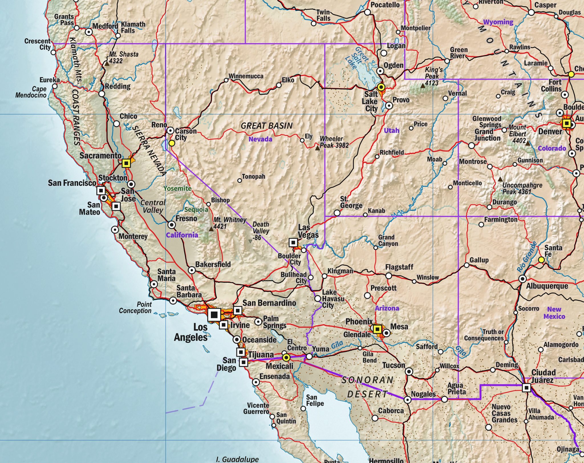 Gedetailleerde natuurkundige kaart van een deel van Noord-Amerika. De VS en Mexico zijn geheel afgebeeld op de kaart, het dichtst bewoonde gebied van Canada ook. De legenda met vooral de weergave van de steden is zeer gedetailleerd. De kleuren geven de klimaatzones aan. De kaart is samengesteld uit de Natural Earth open geodata. Met Engelse tekst.