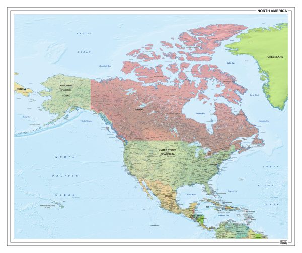 Een zeer gedetailleerde en uitgebreide staatkundige kaart van Noord-Amerika met reliëf ondergrond. De kaart is uitgevoerd in een prachtige kleurencombinatie, heeft een eigentijdse uitstraling en is Engelstalig.