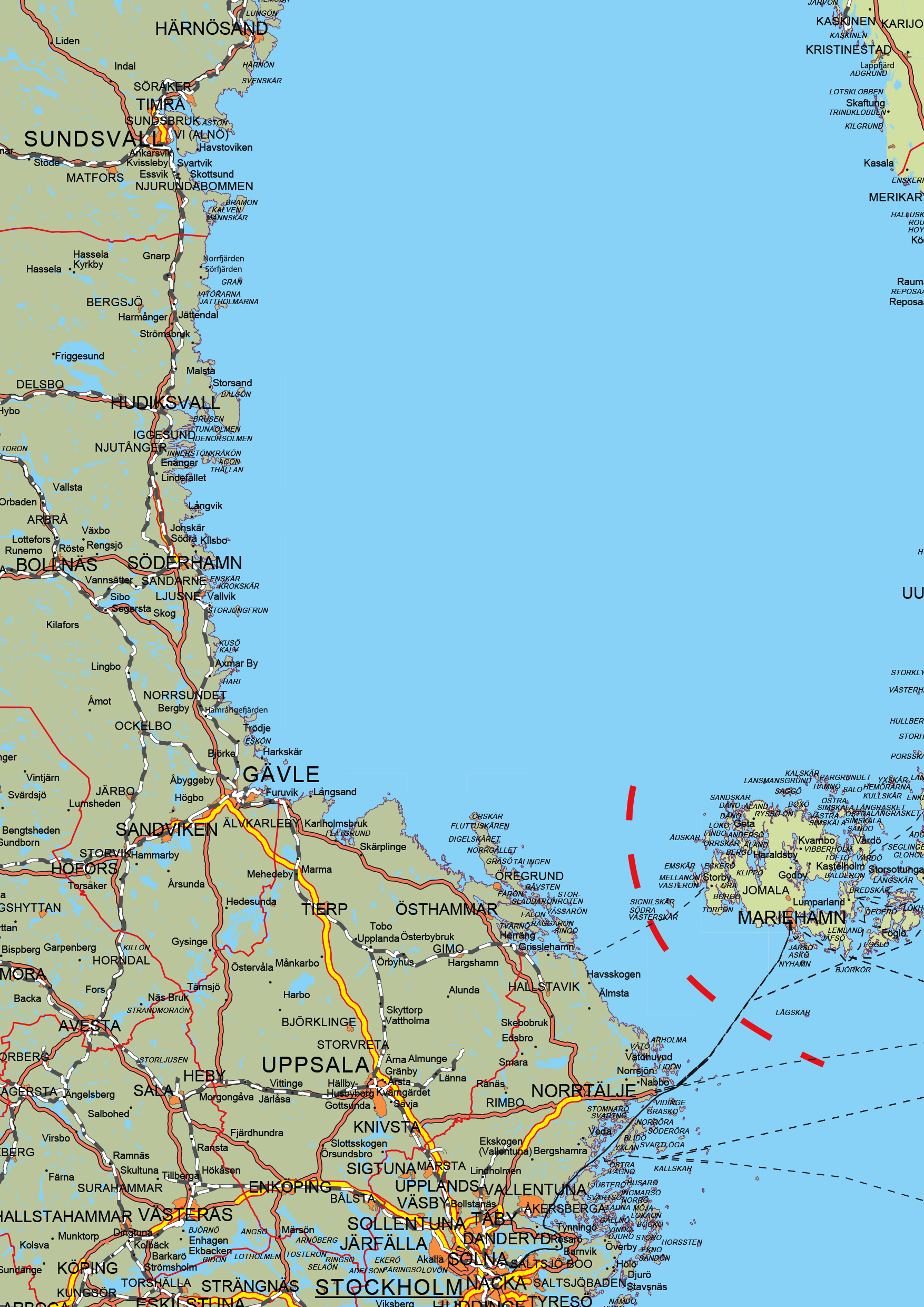 Staatkundige kaart van Scandinavië. De kaart geeft op duidelijke manier alle Scandinavische landen weer. Daarnaast bevat de kaart veel plaatsen, wegen en wateren. Met Engelse tekst.