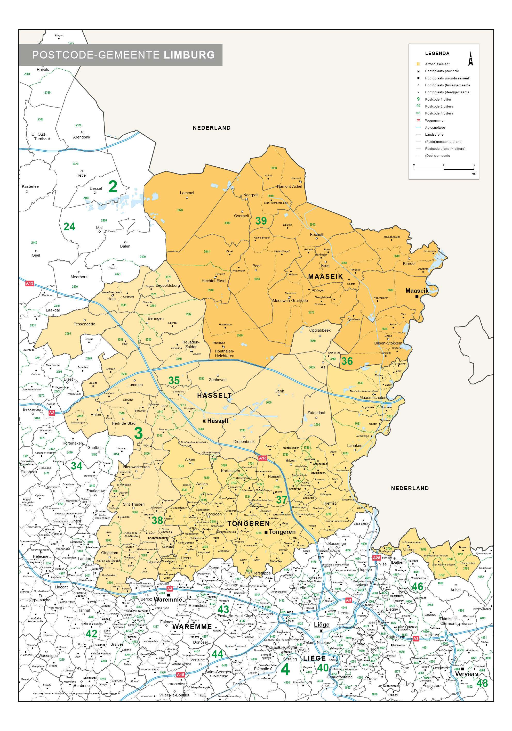 Zeer duidelijke en overzichtelijke administratieve kaart van de provincie Limburg Alle gemeenten en 4-cijferige postcodes zijn overzichtelijk weergegeven met naam en grens. Voor het overzicht zijn ook de 2-cijferige nummers afgebeeld. Alle 2-cijferige postcodegebieden onderscheiden zich van elkaar door het kleurgebruik. Daarnaast zijn alle snelwegen met wegnummers afgebeeld. Van de andere Vlaamse provincies zijn ook administratieve kaarten gemaakt.