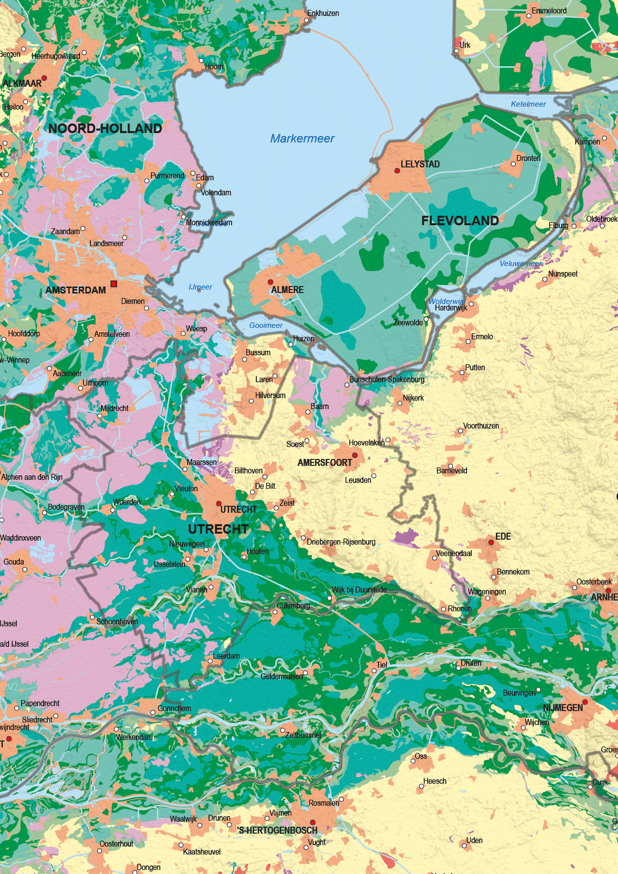 Kaart van Nederland met grondsoorten, stedencontouren en provinciegrenzen. Door de verschillende kleuren worden de grondsoorten duidelijk zichtbaar. De kaart bevat een legenda met alle namen van de grondsoorten zoals zavel, klei, leem, veen en zand.