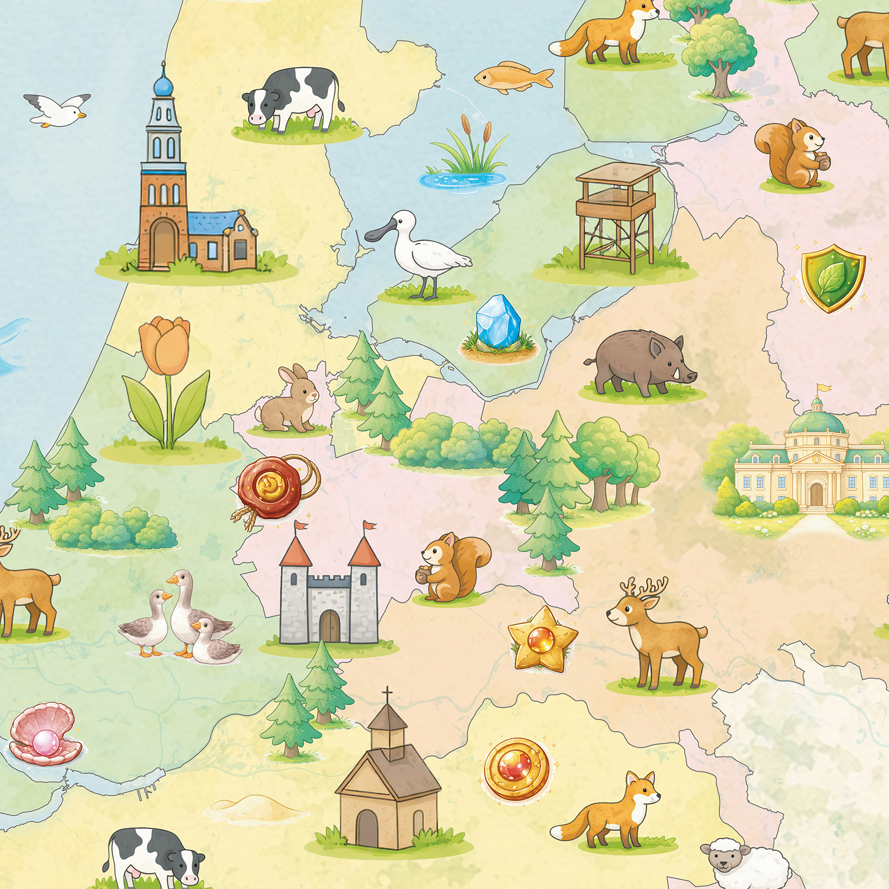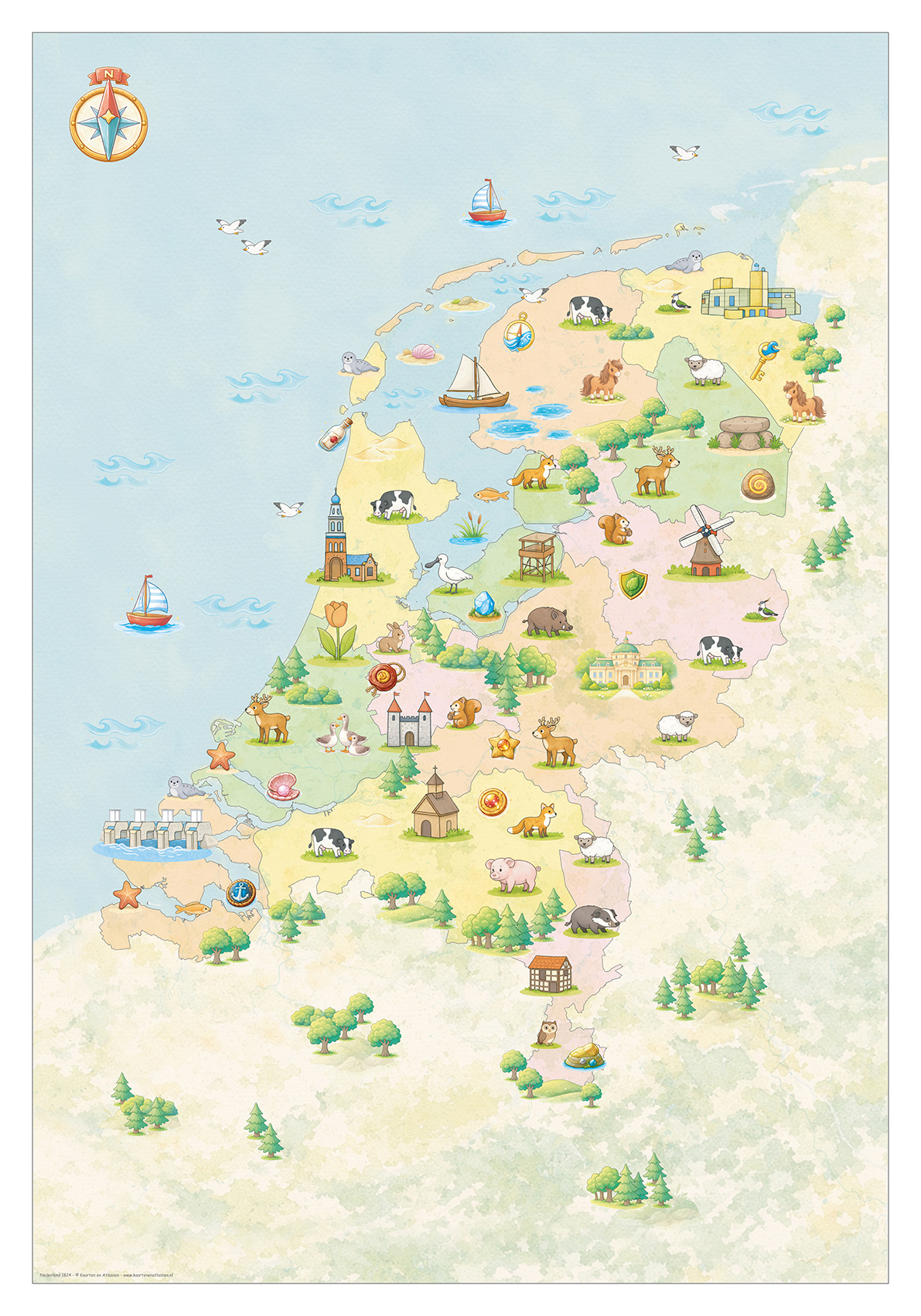 Deze kleurrijke kinderkaart van Nederland combineert spel en educatie in één overzichtelijk ontwerp. Elke provincie heeft een eigen pasteltint en bevat herkenbare dieren, een iconisch gebouw en een kleine verborgen schat. Dat maakt de kaart aantrekkelijk om naar te kijken én leuk om steeds opnieuw iets nieuws op te ontdekken. De kaart is dubbelzijdig bedrukt: aan de ene zijde staan de provincienamen vermeld, aan de andere zijde ontbreken deze. Daardoor is de kaart ideaal om thuis of in de klas de provincies te leren. Tegelijkertijd is het een sfeervolle wandkaart die ook gewoon mooi staat in een kinder- of speelkamer.