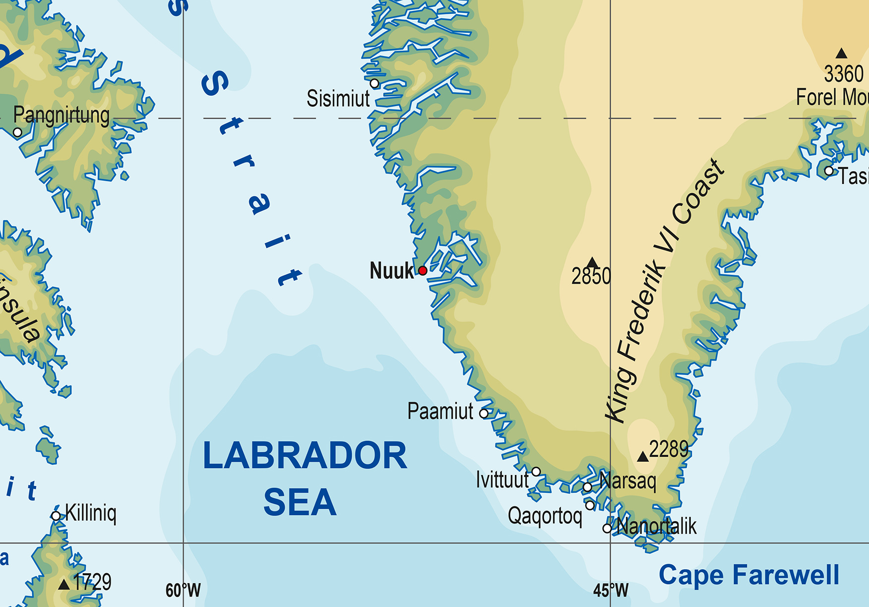 Deze natuurkundige kaart van Groenland laat vooral de grote lijnen van het landschap zien. Het eiland wordt gedomineerd door ijs, hoogvlaktes en ruige kustlijnen, met weinig plaatsen en wegen. Juist daardoor geeft de kaart een helder beeld van de natuurlijke schaal en leegte van Groenland. De afgelopen tijd staat het gebied vaker in de belangstelling van grote mogendheden, wat de aandacht voor deze regio heeft vergroot. Deze kaart focust echter niet op politiek, maar op de fysieke kenmerken die Groenland uniek maken binnen het noordpoolgebied.