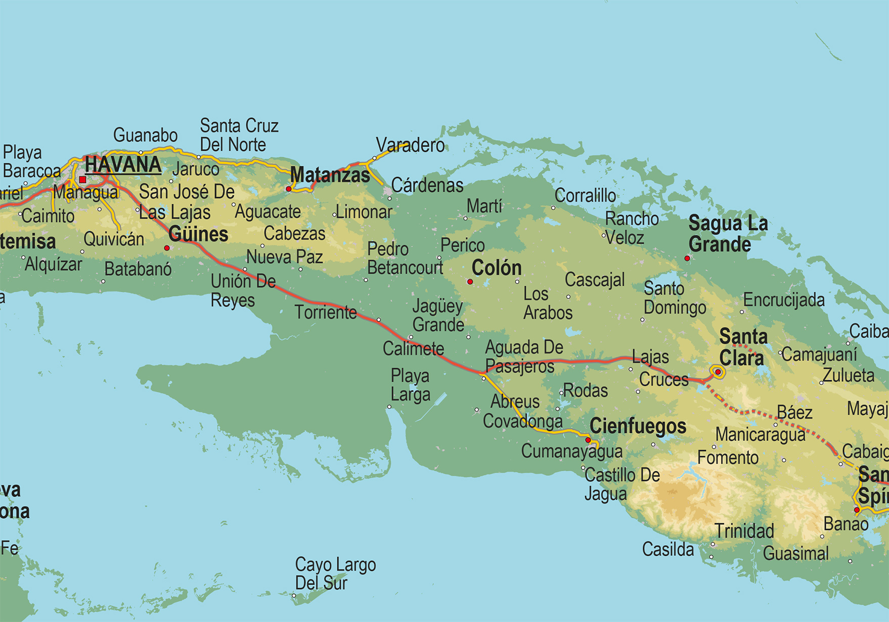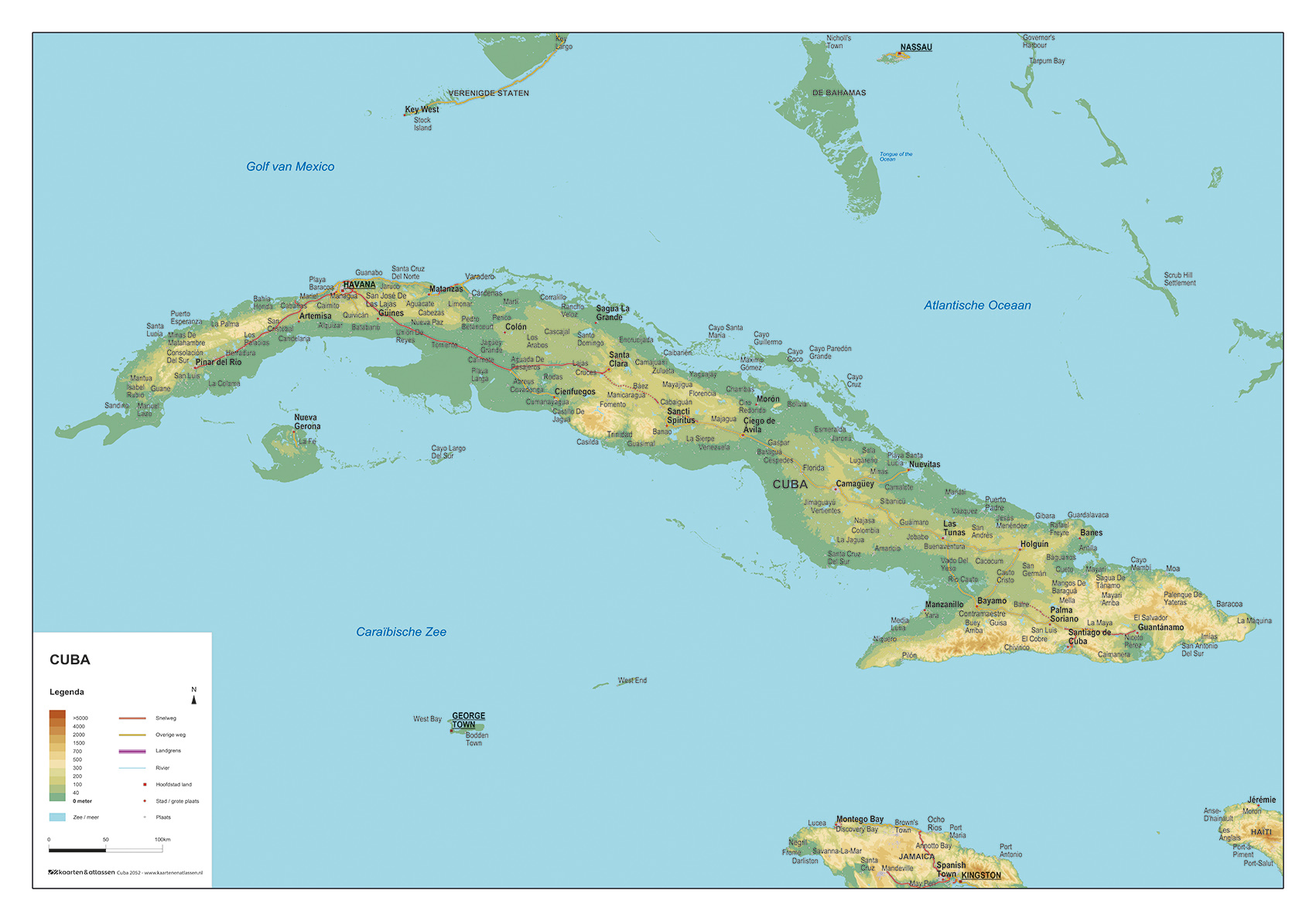 Deze natuurkundige kaart van Cuba laat het eiland zien in zijn natuurlijke vorm. Hoogteverschillen, berggebieden en laagvlaktes zijn duidelijk weergegeven. Ook kustlijnen en waterstructuren zijn goed zichtbaar. De kaart geeft een helder overzicht van het landschap en de geografische opbouw van Cuba. Geschikt voor wie inzicht wil krijgen in de natuurlijke kenmerken van het eiland, zonder nadruk op steden of politiek.
