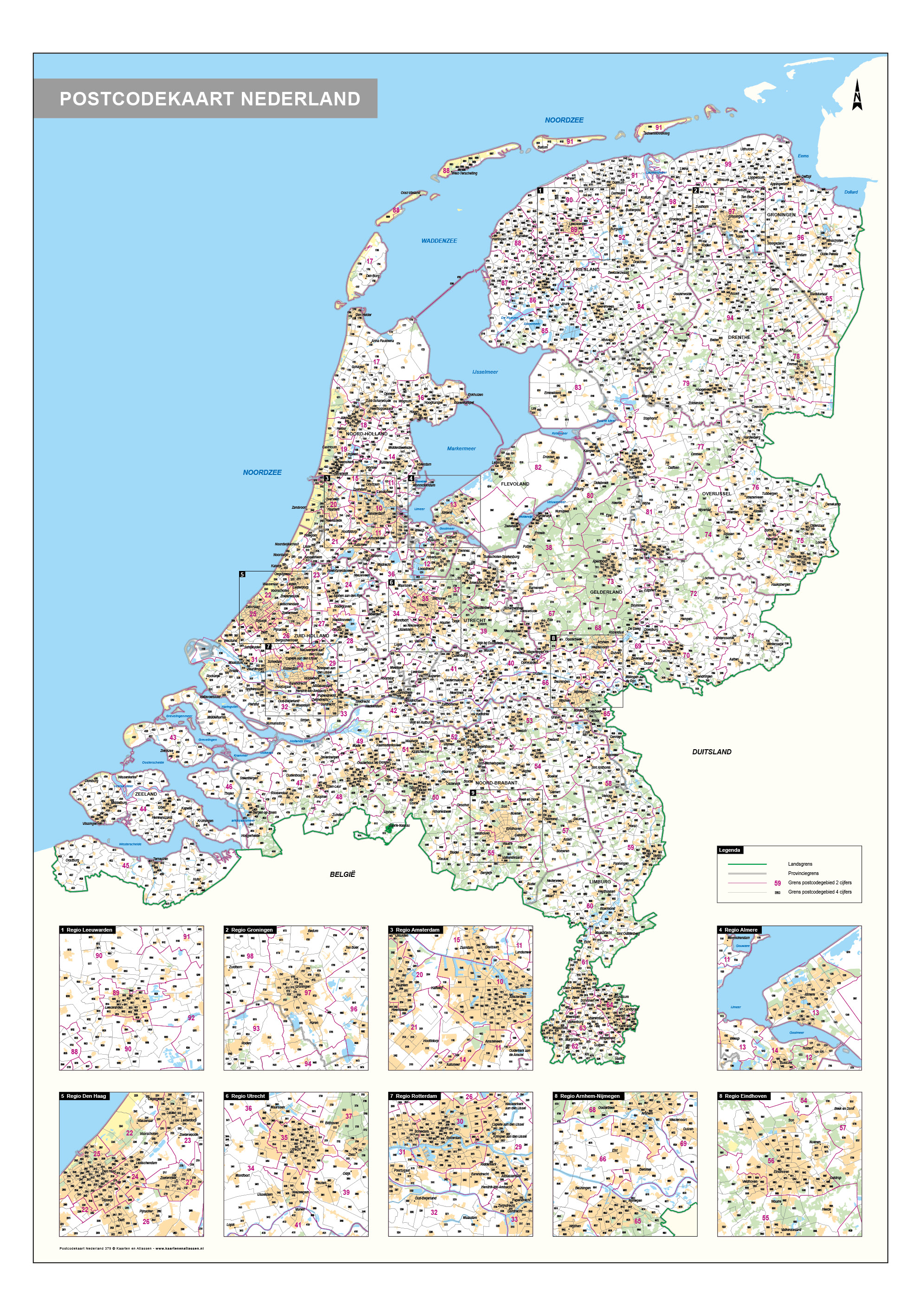 Postcodekaart van Nederland. Geeft naast de 4-cijferige postcodegebieden ook de 2-cijferige postcodegebieden weer. Daarnaast aparte kaarten van de grotere steden van nederland. De kaart is in 2020 geheel geupdate.
