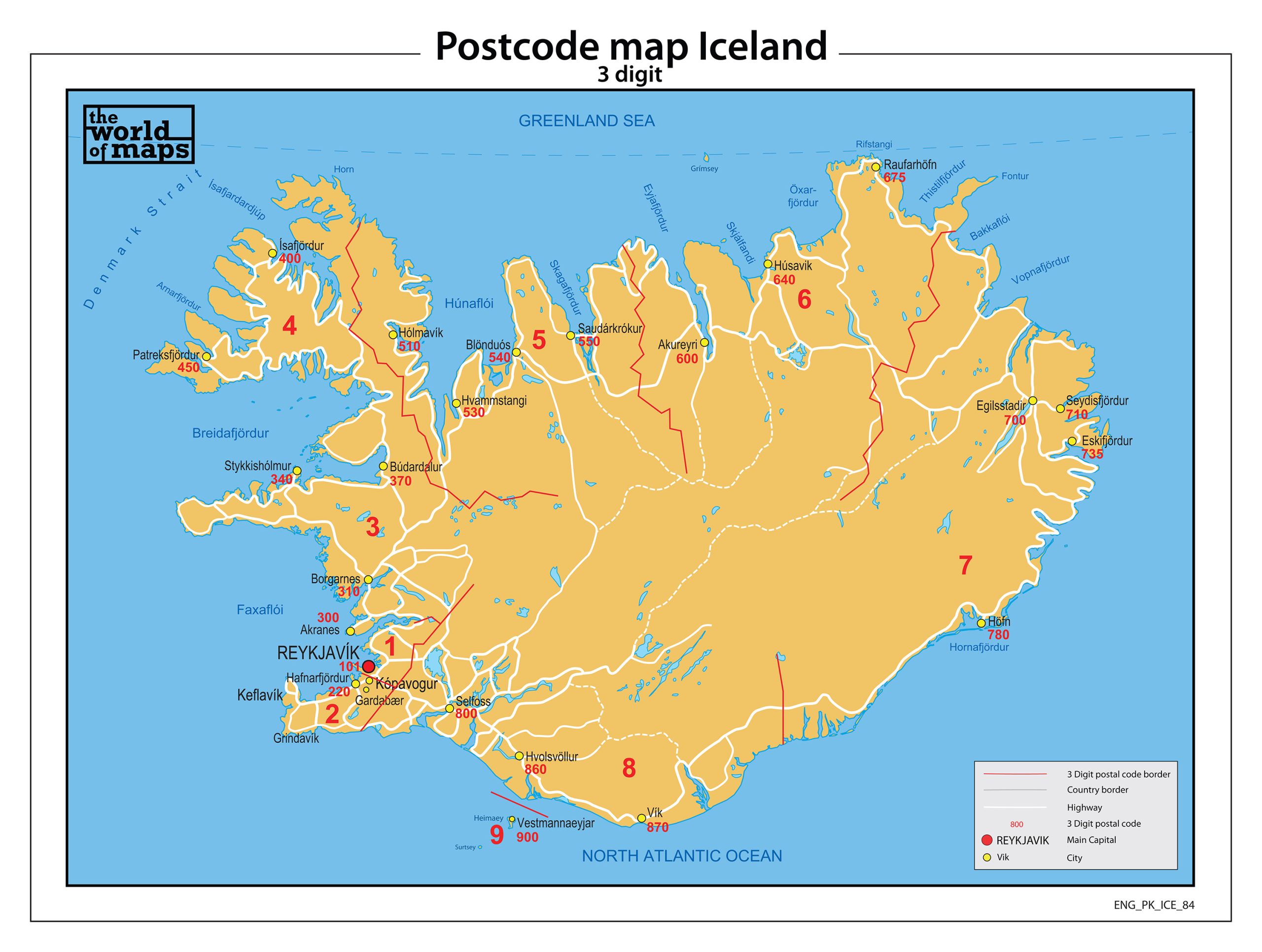 Duidelijke 3-cijferige postcodekaart van IJsland. Engelstalig. Met duidelijk legenda overzicht.