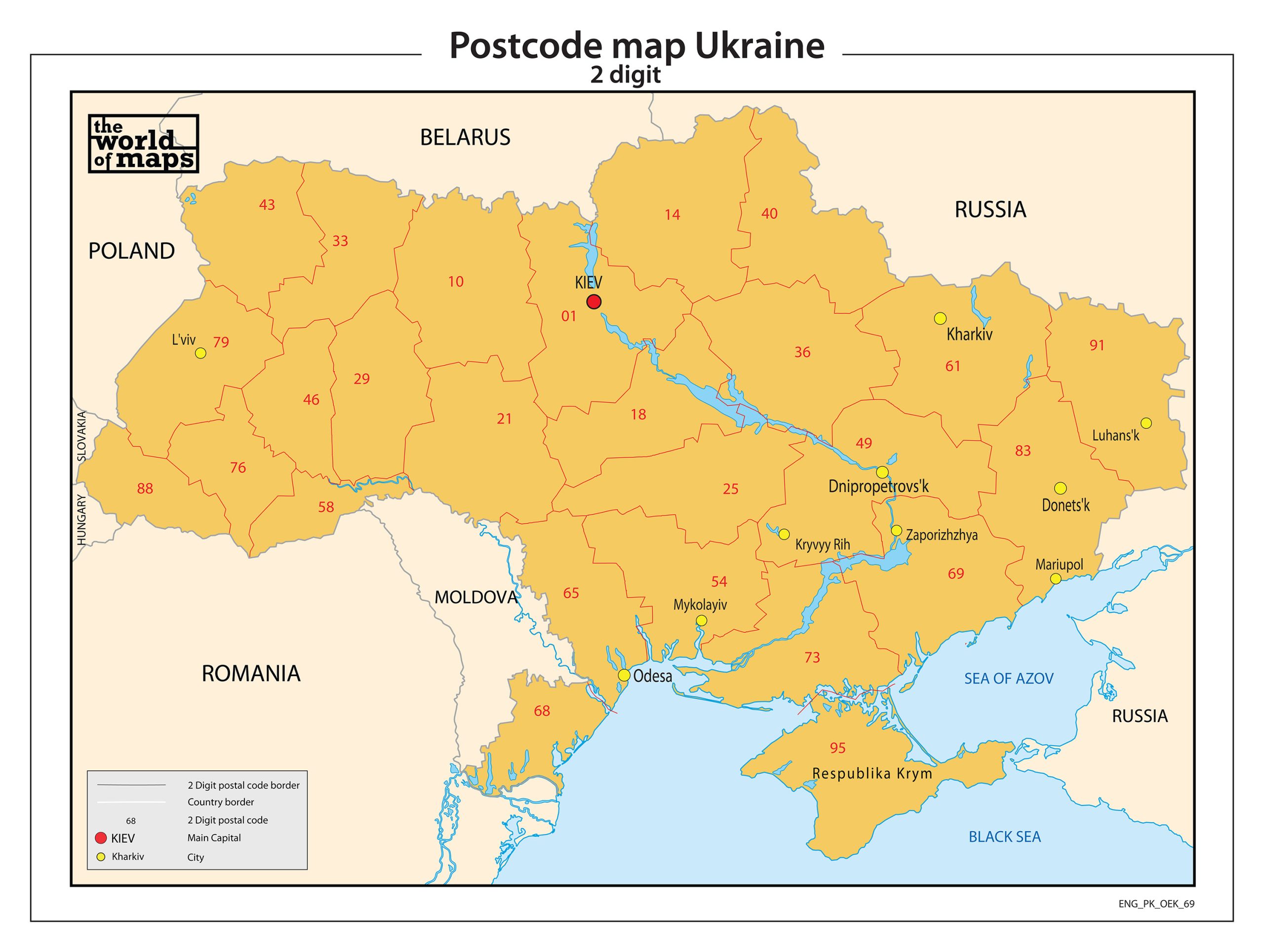 Overzichtelijke 2-cijferige postcodekaart van Oekraïne. Engelstalig. Met duidelijk legendaoverzicht.