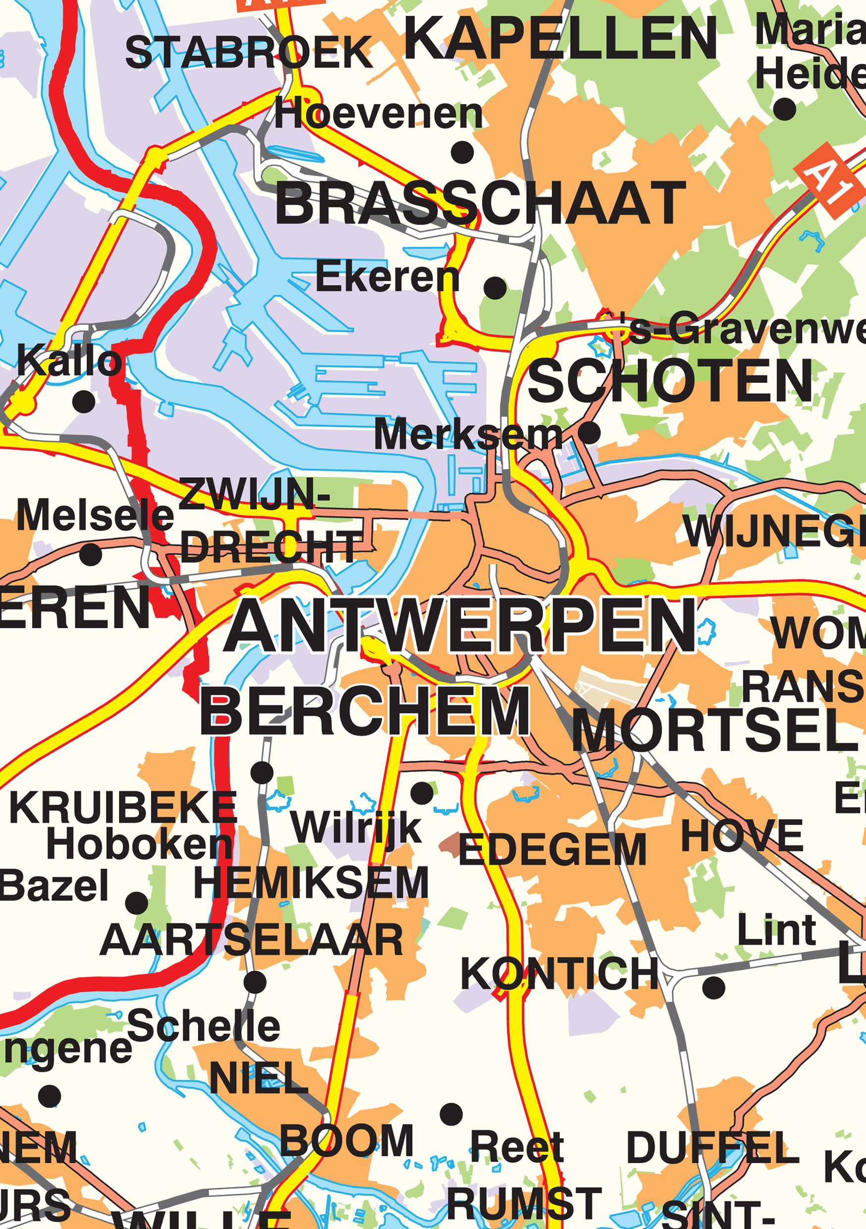 Deze kaart bevat naast de provinciegrenzen en grotere steden veel kleinere plaatsen, wegen en wateren van de provincie Antwerpen. De kaart geeft ook mooi het grondgebruik weer.