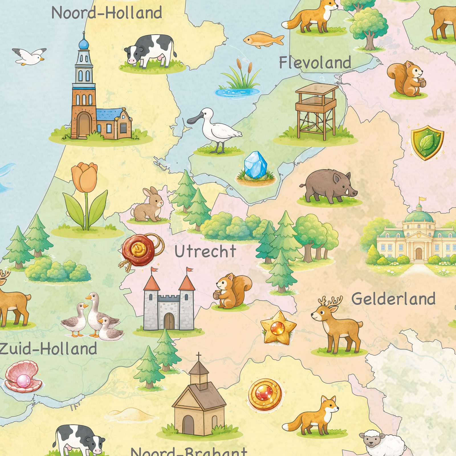 Deze kleurrijke kinderkaart van Nederland combineert spel en educatie in één overzichtelijk ontwerp. Elke provincie heeft een eigen pasteltint en bevat herkenbare dieren, een iconisch gebouw en een kleine verborgen schat. Dat maakt de kaart aantrekkelijk om naar te kijken én leuk om steeds opnieuw iets nieuws op te ontdekken. De kaart is dubbelzijdig bedrukt: aan de ene zijde staan de provincienamen vermeld, aan de andere zijde ontbreken deze. Daardoor is de kaart ideaal om thuis of in de klas de provincies te leren. Tegelijkertijd is het een sfeervolle wandkaart die ook gewoon mooi staat in een kinder- of speelkamer.