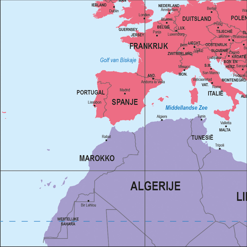 Staatkundige Wereldkaart in moderne uitvoering in de Nederlandse taal. Een eenvoudige wereldkaart uitgevoerd in krachtige kleuren. De basis van deze kaart vormen de continenten. De kaart is uitermate geschikt voor scholen, kinderkamers maar ook voor mensen die op zoek zijn naar een duidelijke eenvoudige wereldkaart. De kaart kan ook op andere formaten geleverd worden. We hebben deze kaart ook beschikbaar in de standaard Mercator projectie.