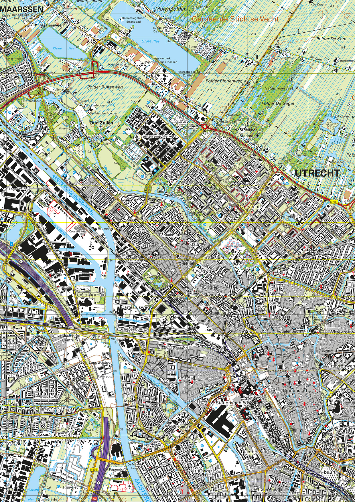 Topografische kaart van Groot Utrecht. Geeft op een zeer duidelijke manier alle informatie weer. Ook Houten en Nieuwegein zijn op de kaart afgebeeld. Een straatnamenkaart van Utrecht vind je hier.