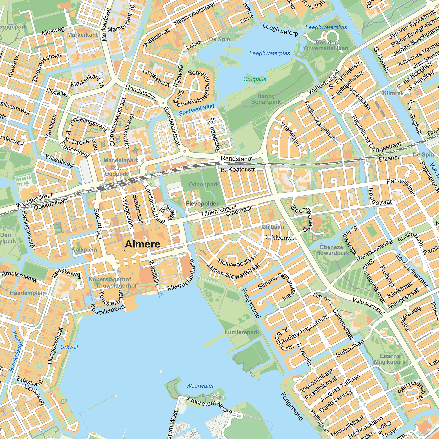Ontdek Almere op een unieke manier met deze gedetailleerde straatnamenkaart. De kaart toont vrijwel alle straten, groenvoorzieningen en waterpartijen die Almere rijk is. Perfect als stijlvolle wandkaart of als digitaal bestand voor persoonlijk gebruik. Deze plattegrond van Almere combineert overzicht en esthetiek, ideaal voor liefhebbers van de stad. Bekijk ook onze andere stedenkaarten van Nederland.