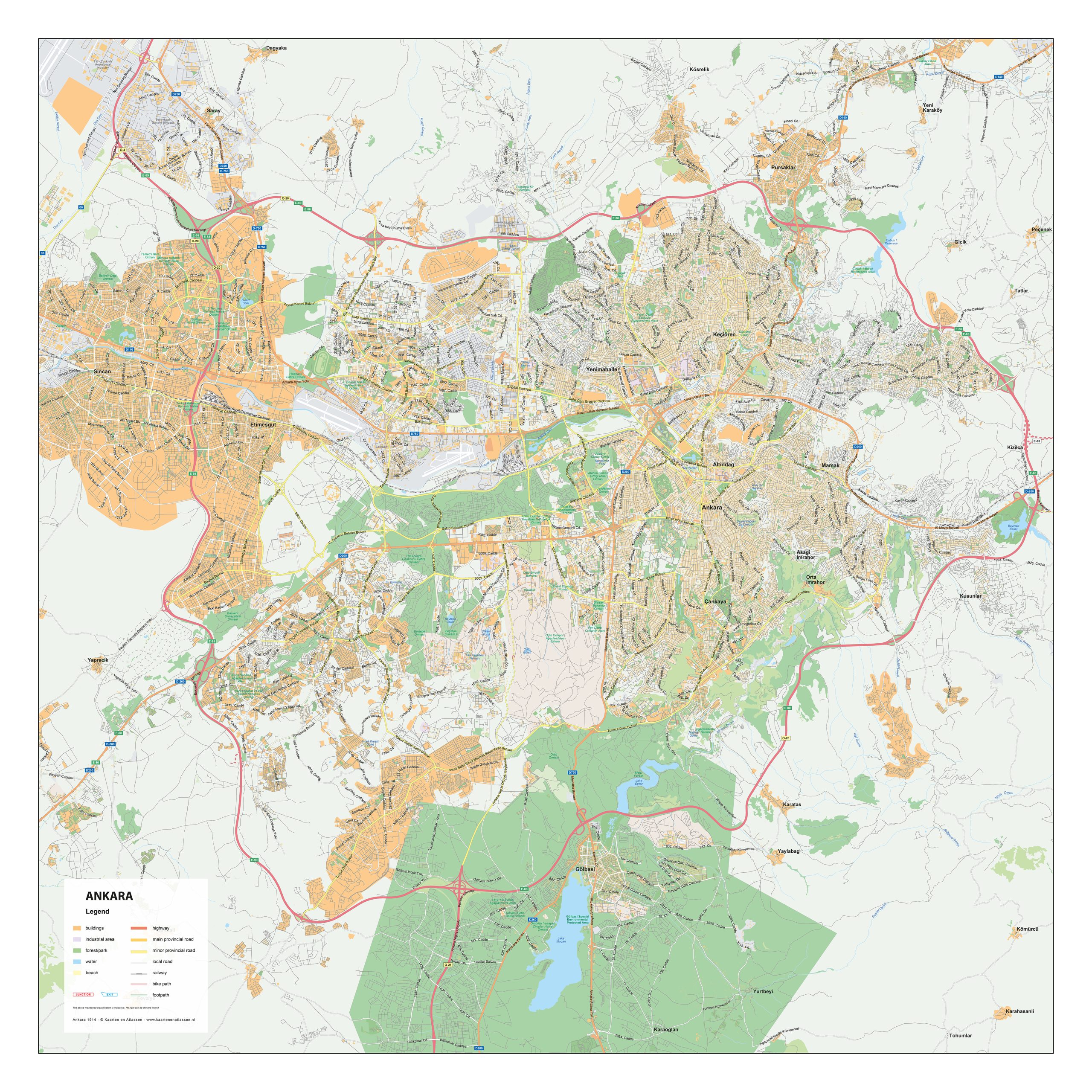 Deze gedetailleerde stadsplattegrond van Ankara toont de uitgestrekte hoofdstad van Turkije met haar kenmerkende stadsdelen, heuvelachtig reliëf en duidelijke hoofdwegen. Van het oude centrum rondom het kasteel tot de moderne wijken in het zuiden: straten, pleinen, waterpartijen en groen zijn overzichtelijk weergegeven. De kaart is beschikbaar als wandkaart of digitaal bestand en laat Ankara zien in al zijn veelzijdigheid. Bekijk ook onze andere stadsplattegronden van Europese hoofdsteden.