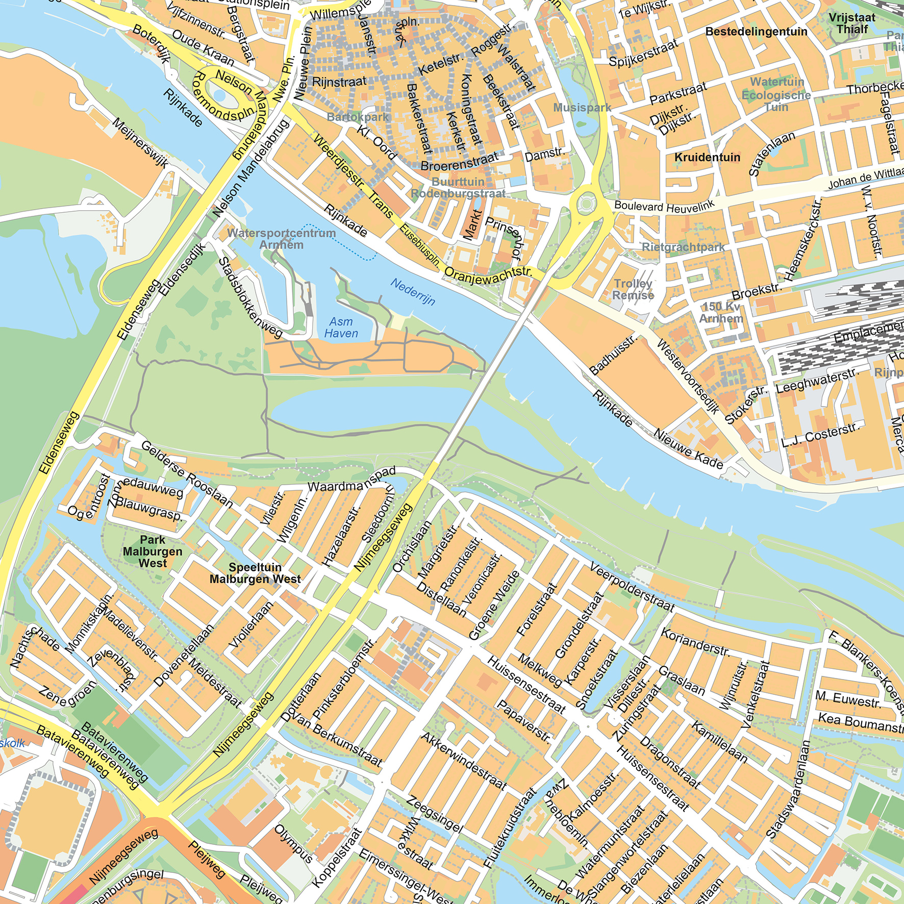Deze stedenkaart van Arnhem geeft een duidelijk en volledig overzicht van de stad. Straten, waterlopen en groene zones zijn helder weergegeven in een moderne vormgeving. De kaart is beschikbaar als wandkaart en als digitaal bestand. Deze plattegrond van Arnhem laat zowel het centrum als de omliggende wijken overzichtelijk zien. Bekijk ook onze andere stadsplattegronden van Nederland.