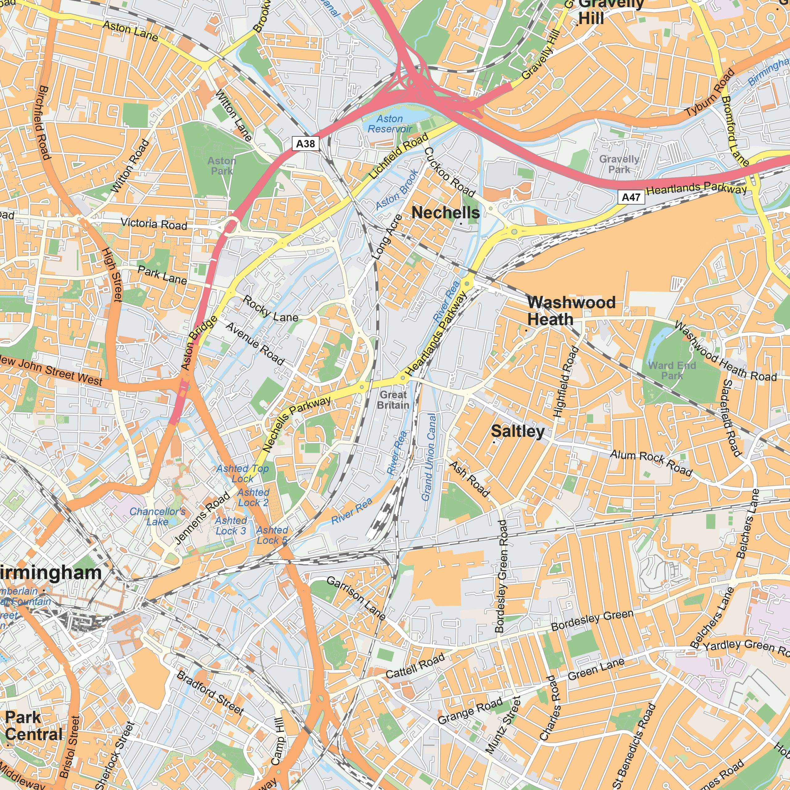 Deze gedetailleerde stadsplattegrond van Birmingham toont de levendige stad in het hart van Engeland: van het centrum met de Bullring en Jewellery Quarter tot de wijken Edgbaston, Moseley en Digbeth. Straten, waterwegen, parken en pleinen zijn helder en overzichtelijk weergegeven. De kaart is beschikbaar als wandkaart of digitaal bestand en laat Birmingham zien als een stad vol geschiedenis, cultuur en stedelijke diversiteit. Bekijk ook onze andere stadsplattegronden van het Verenigd Koninkrijk.