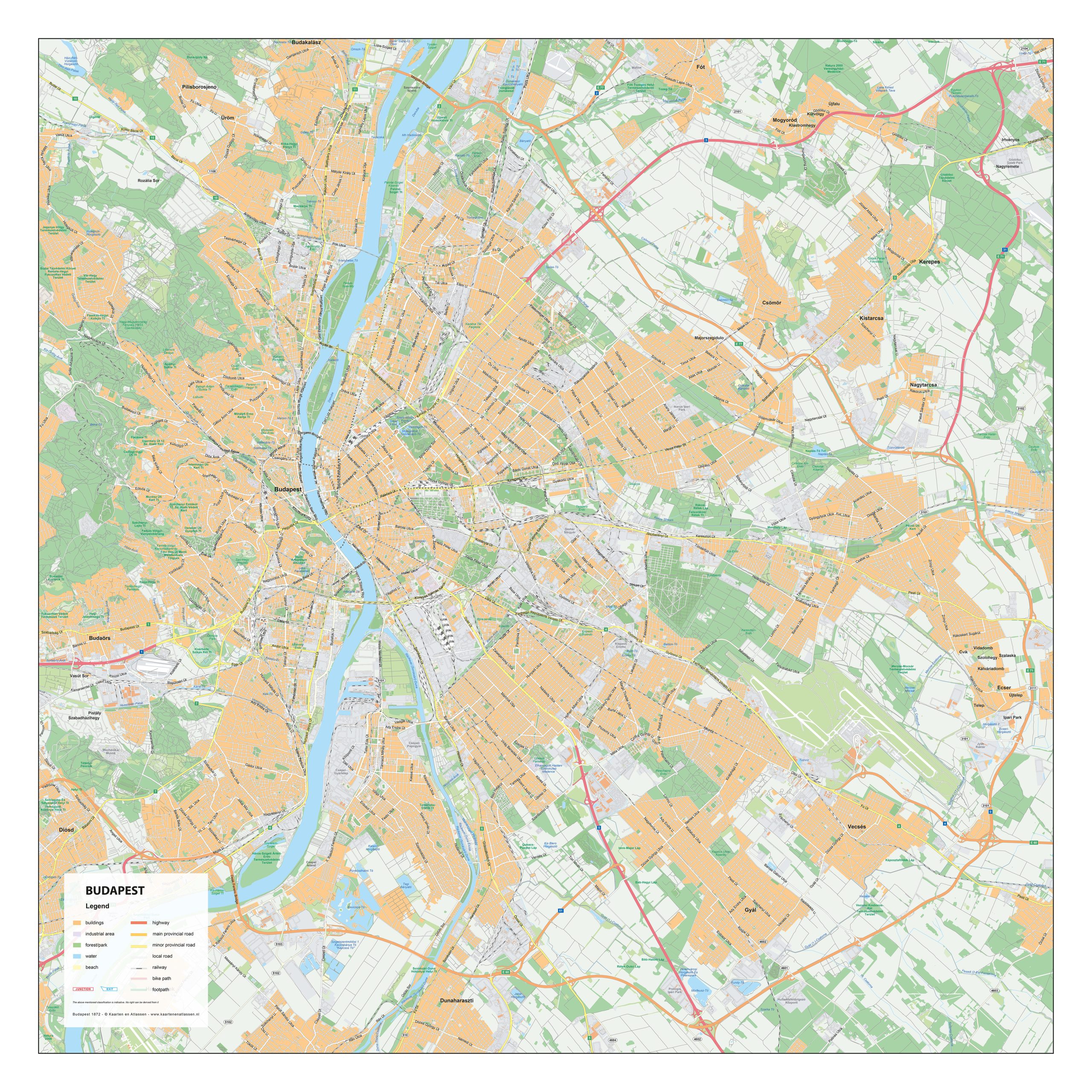 Deze gedetailleerde stadsplattegrond van Boedapest toont de Hongaarse hoofdstad aan weerszijden van de Donau: het heuvelachtige Buda en het vlakke, stedelijke Pest. De bruggen, historische wijken, grote boulevards en parken zijn duidelijk weergegeven. De kaart is beschikbaar als wandkaart of digitaal bestand en geeft een mooi overzicht van deze indrukwekkende en ruim opgezette stad. Bekijk ook onze andere stadsplattegronden van Europese hoofdsteden.