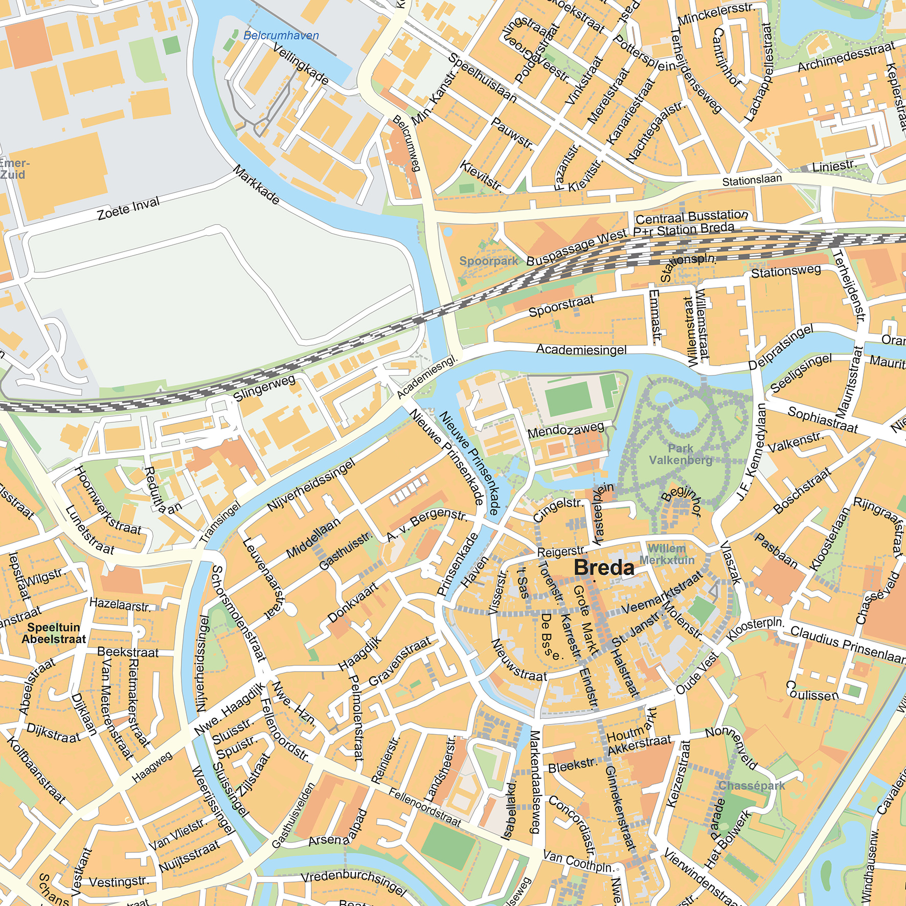 Deze stedenkaart van Breda toont de stad in detail met straten, waterlopen en groene zones. Het historische centrum en de omliggende wijken zijn duidelijk weergegeven in een heldere vormgeving. De kaart is beschikbaar als wandkaart en als digitaal bestand. Deze plattegrond van Breda biedt een overzichtelijk beeld van de stad en haar omgeving. Bekijk ook onze andere stadsplattegronden van Nederland.