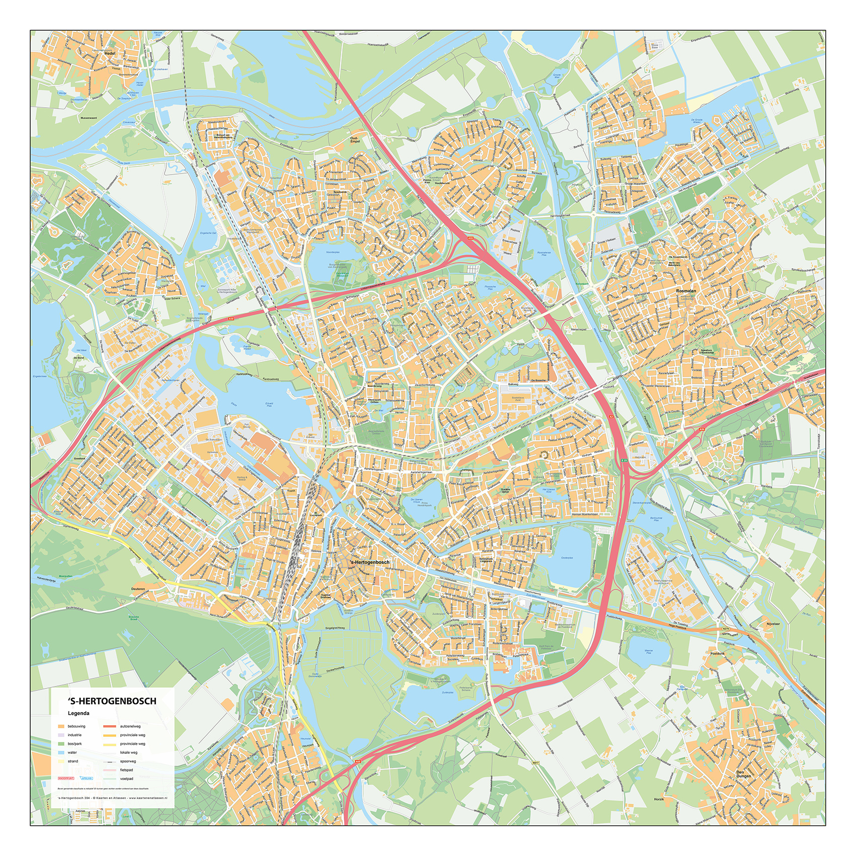 Gedetailleerde stedenkaart van Den Bosch met vrijwel alle straten, waterlopen en groene zones. Van de historische binnenstad en de Binnendieze tot aan De Groote Wielen en Maaspoort – deze kaart laat de stad in zijn volle breedte zien. Geschikt als wandkaart of digitaal bestand. De plattegrond van ’s-Hertogenbosch is nauwkeurig vormgegeven en toont zowel de oude kern als de moderne stadsdelen. Bekijk ook onze andere stadsplattegronden van Nederland.