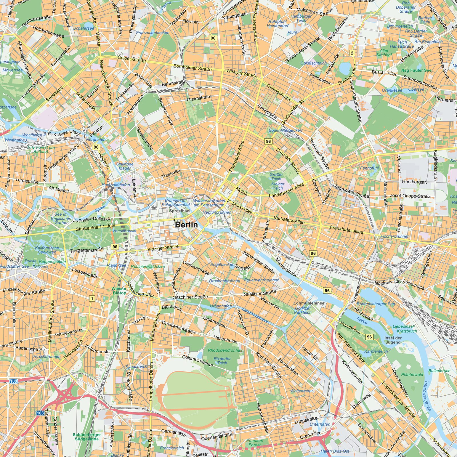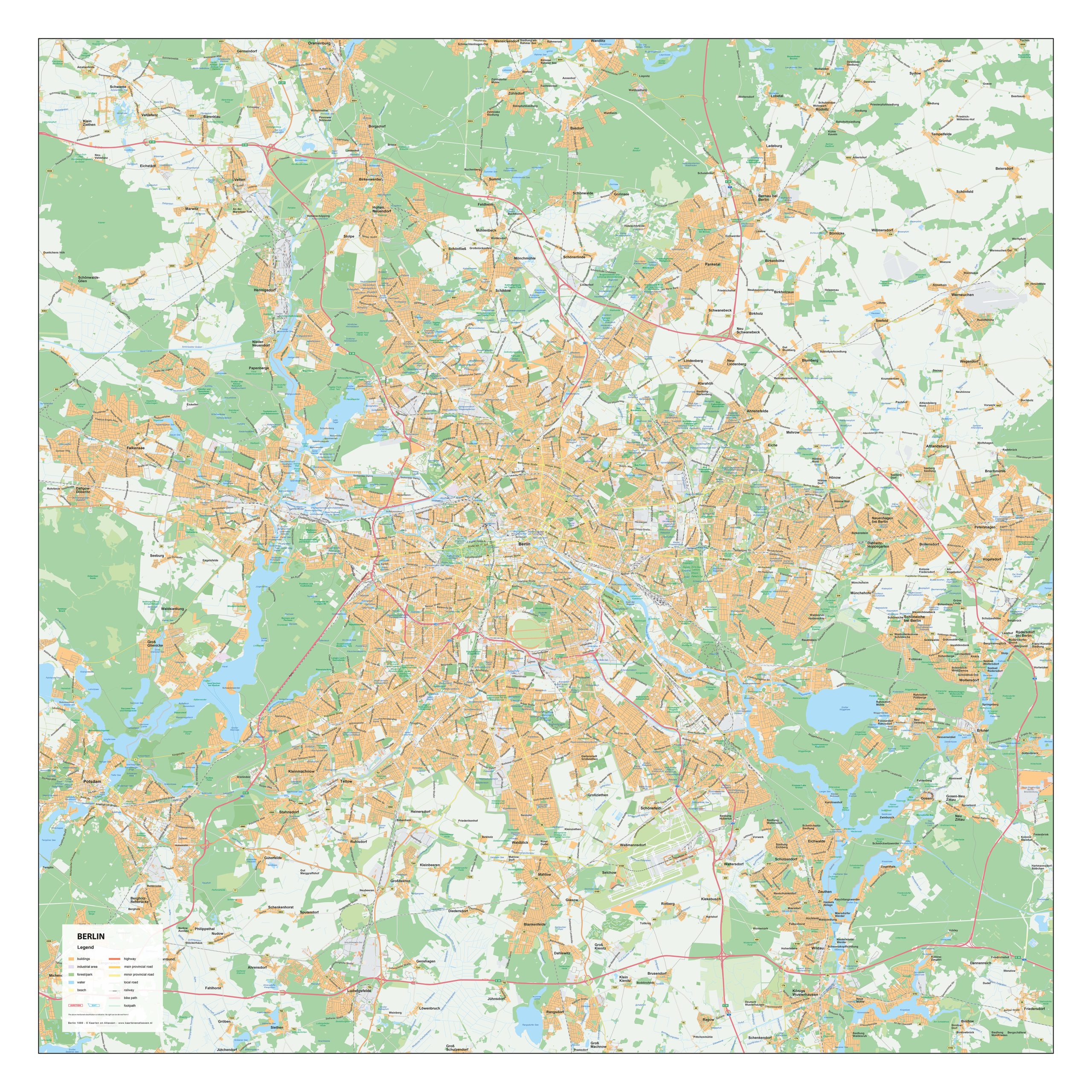 Deze gedetailleerde kaart toont Berlijn in combinatie met de omliggende regio, inclusief voorsteden, infrastructuur en uitgestrekte natuurgebieden. Van het stedelijke centrum tot plaatsen als Potsdam, Bernau en Königs Wusterhausen – alles is overzichtelijk weergegeven. De kaart is beschikbaar als wandkaart of digitaal bestand en biedt een helder totaalbeeld van Berlijn en zijn omgeving. Ook hebben we een gedetailleerde kaart van Berlijns stadscentrum.