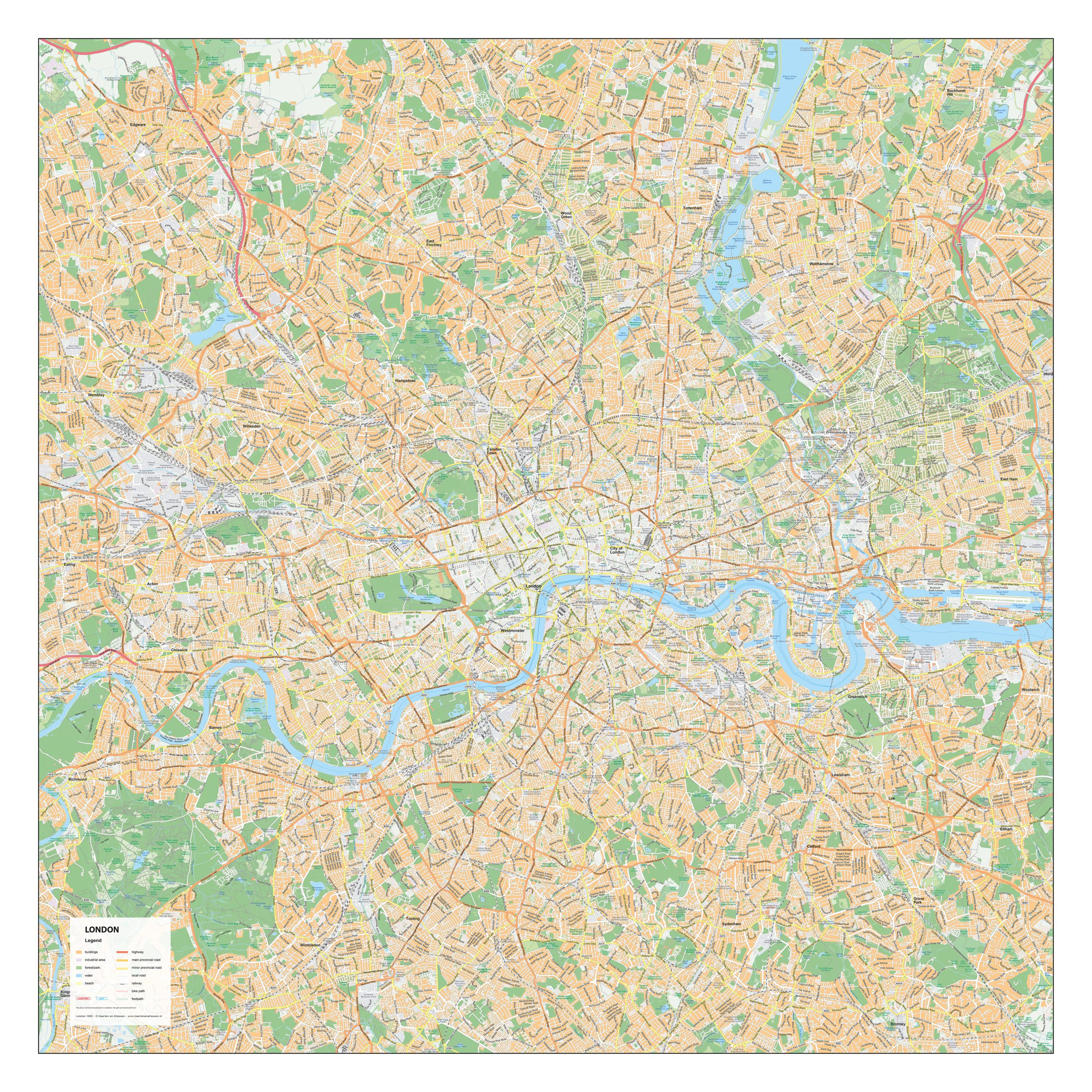 Deze uitgebreide kaart toont Londen inclusief de uitgestrekte stadsdelen en voorsteden rondom het centrum. Straten, groene zones, rivieren en infrastructuur zijn helder weergegeven, waardoor het stedelijke gebied in samenhang zichtbaar is. Beschikbaar als wandkaart of digitaal bestand, ideaal voor wie Londen en omgeving compleet wil overzien. Ook hebben we een gedetailleerde kaart van Londens stadscentrum.