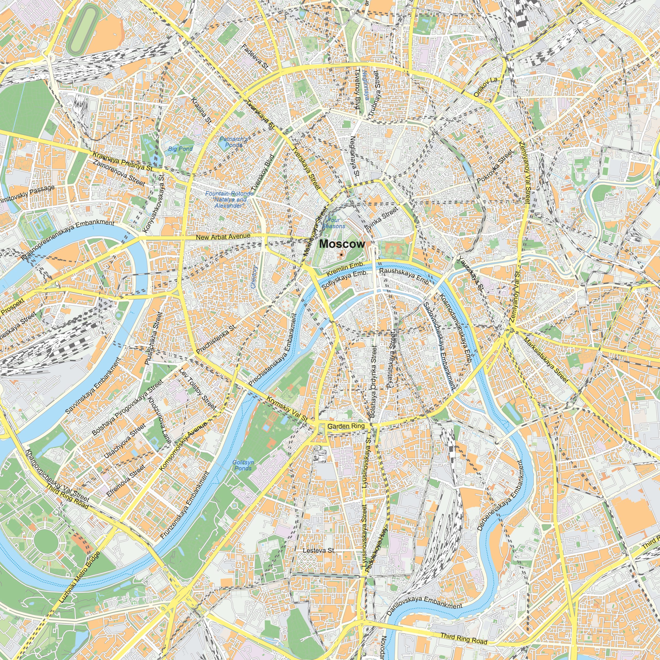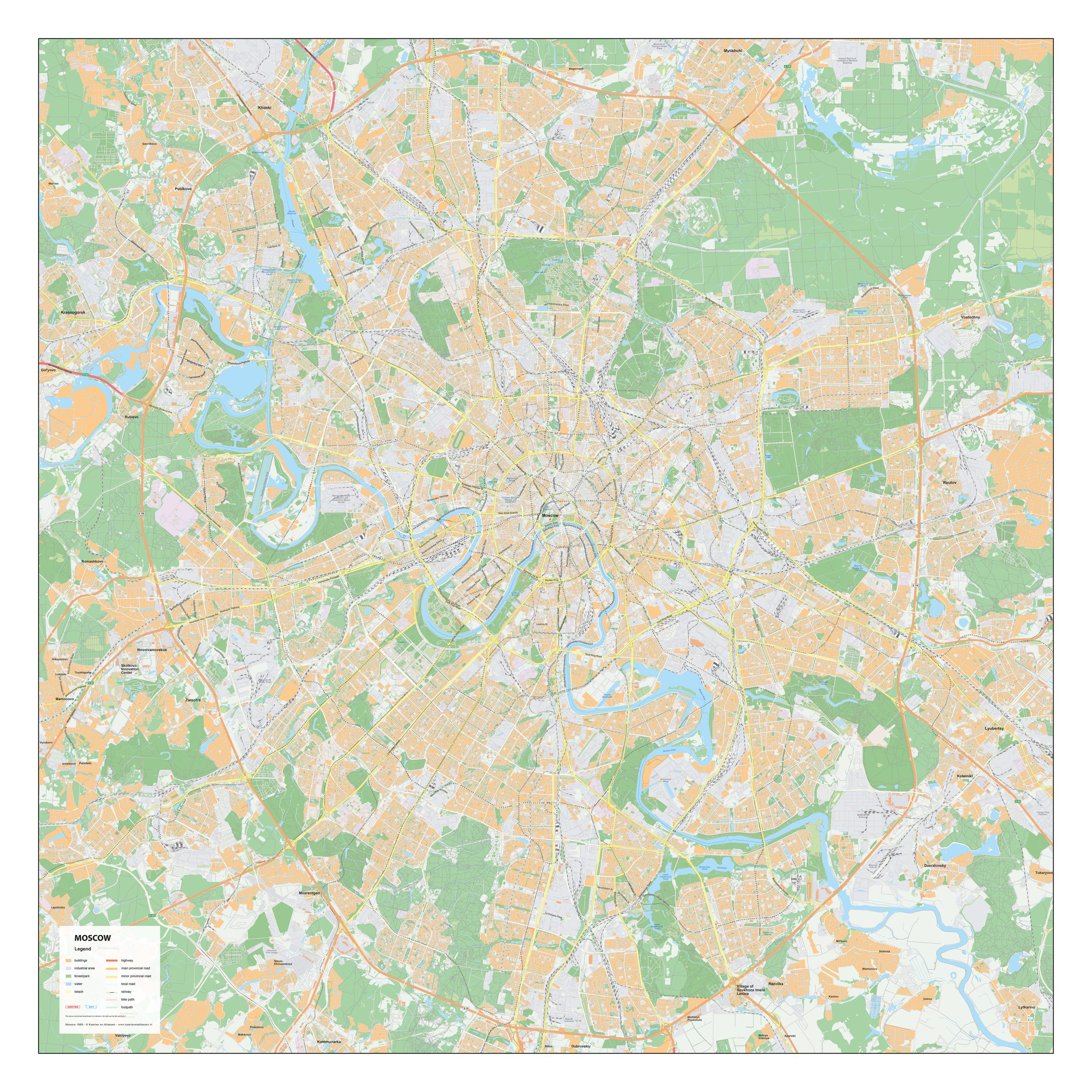 Deze uitgebreide kaart toont Moskou met de uitgestrekte voorsteden en omliggende regio. Straten, infrastructuur, groene gebieden en waterpartijen zijn overzichtelijk weergegeven, waardoor het stedelijke gebied in zijn geheel zichtbaar is. Beschikbaar als wandkaart of digitaal bestand, ideaal voor wie Groot-Moskou en omgeving volledig wil overzien. Ook hebben we een gedetailleerde kaart van Moskou’s stadscentrum.