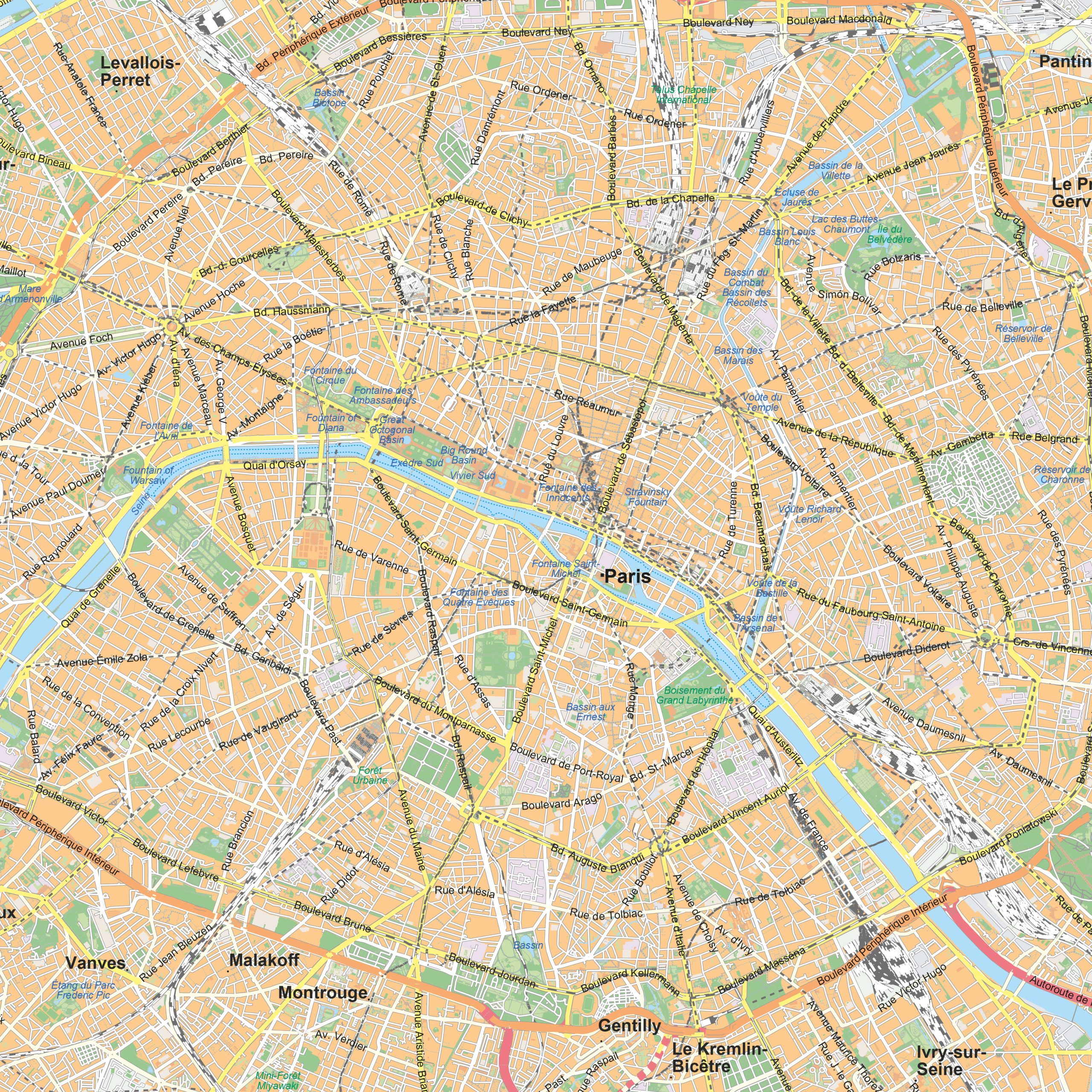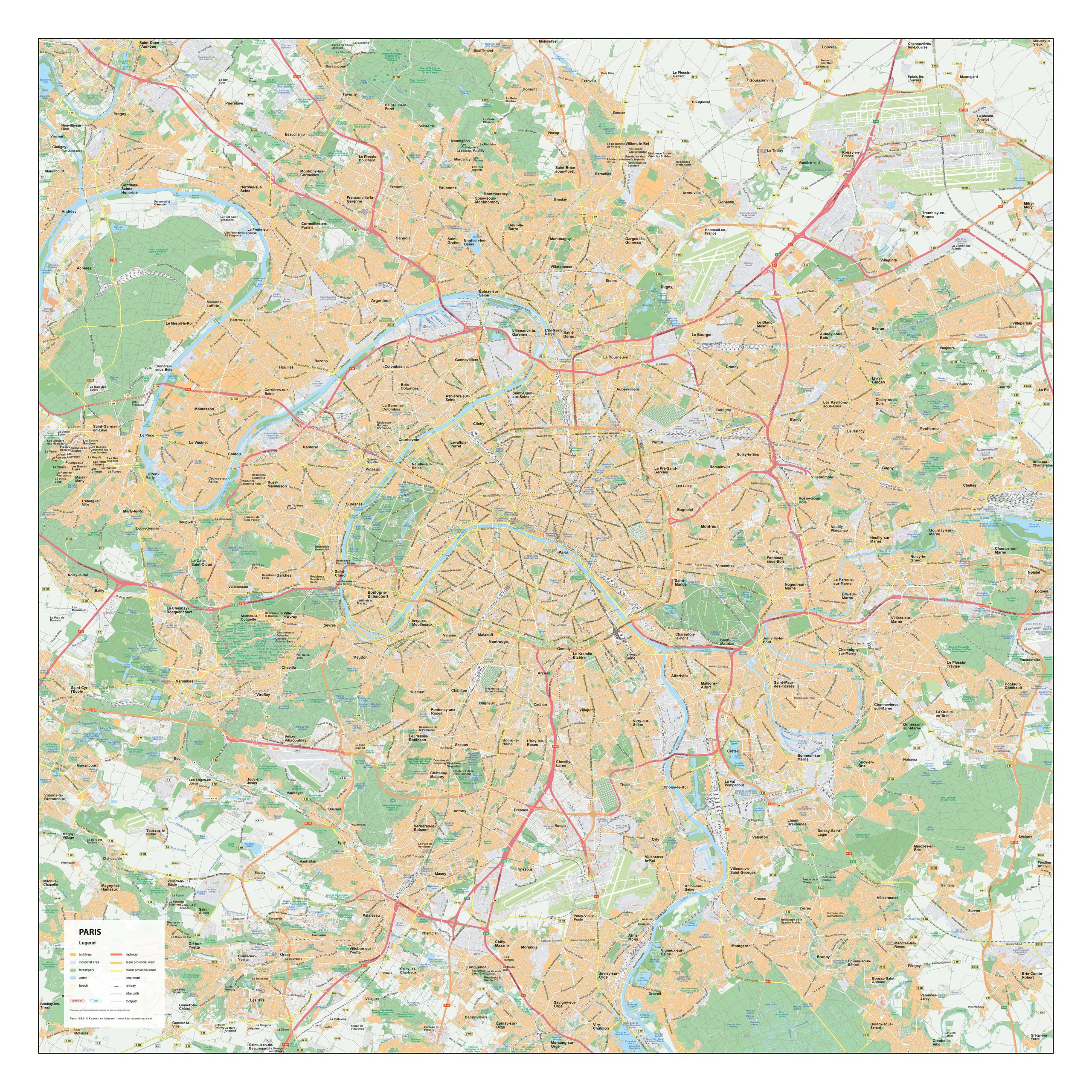 Deze uitgebreide kaart toont Parijs in samenhang met de omliggende voorsteden en regio’s, zoals Saint-Denis, Boulogne-Billancourt en Versailles. Straten, spoorlijnen, infrastructuur en groengebieden zijn overzichtelijk weergegeven. De kaart is beschikbaar als wandkaart of digitaal bestand en biedt een compleet beeld van de stedelijke structuur van Groot-Parijs. Ook hebben we een gedetailleerde kaart van Parijs’ stadscentrum.