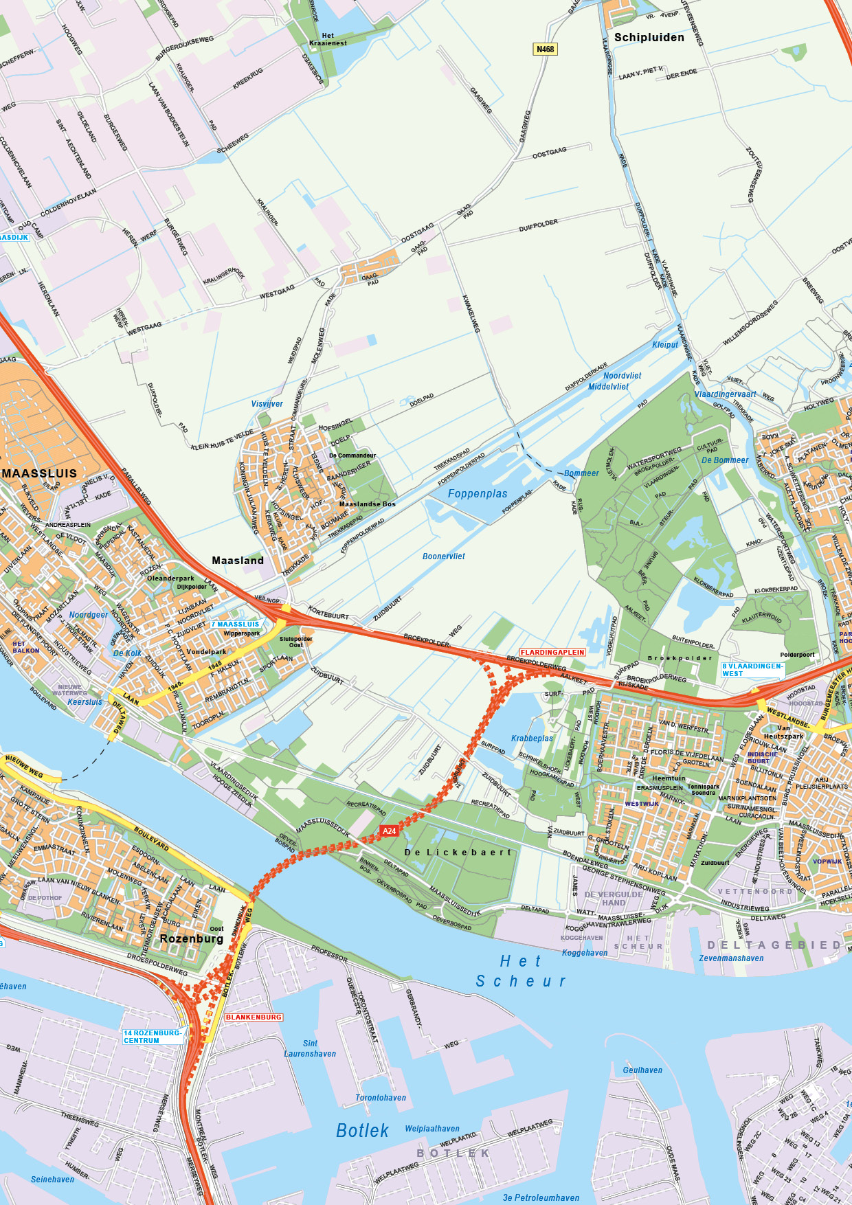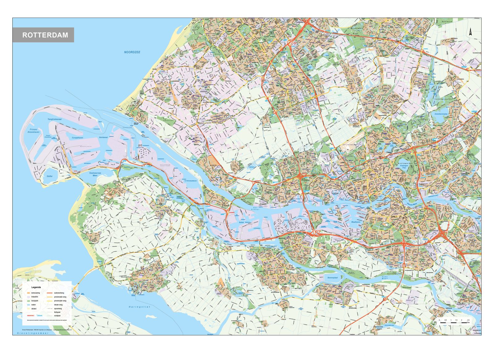Zeer duidelijke kaart van Rotterdam, Rijnmond en omgeving. Met de Maasvlakte, Europoort en plaatsen als Hellevoetsluis, Krimpen aan den IJssel, Delft en gedeeltelijk Zoetermeer en Den Haag. De kaart geeft informatie over bebouwing en industrie. Ook parken, bos, water en strand staan op de kaart. Het complete wegennet wordt weergegeven: autosnelwegen, provinciale wegen, lokale wegen, spoorwegen en zelfs fietspaden en voetpaden. Wegennummers, knooppunten en afslagnummers en afslagnamen staan vermeld. Kortom, een zeer complete kaart. Met duidelijke legenda. Voor een kleiner gebied is er de kaart Rotterdam 404.