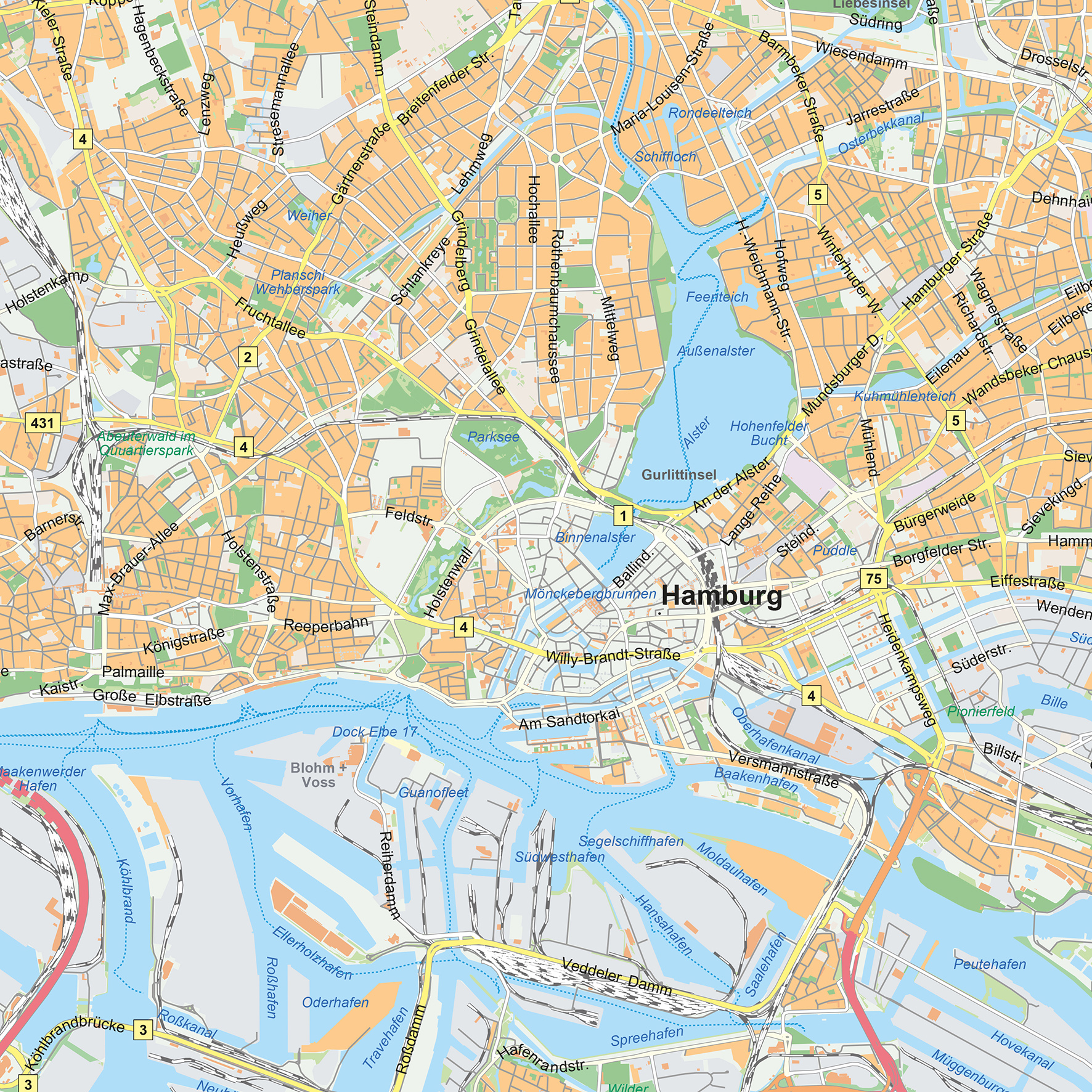 Deze gedetailleerde stadsplattegrond van Hamburg laat de veelzijdige havenstad aan de Elbe zien: van het historische Speicherstadt en de haven tot levendige wijken als St. Pauli, Altona en Eimsbüttel. Straten, waterlopen, parken en pleinen zijn overzichtelijk weergegeven. De kaart is beschikbaar als wandkaart of digitaal bestand en toont Hamburg in zijn volle stedelijke diepte – met ruimte voor water, historie en moderne stadsontwikkeling. Bekijk ook onze andere stadsplattegronden van Duitsland.