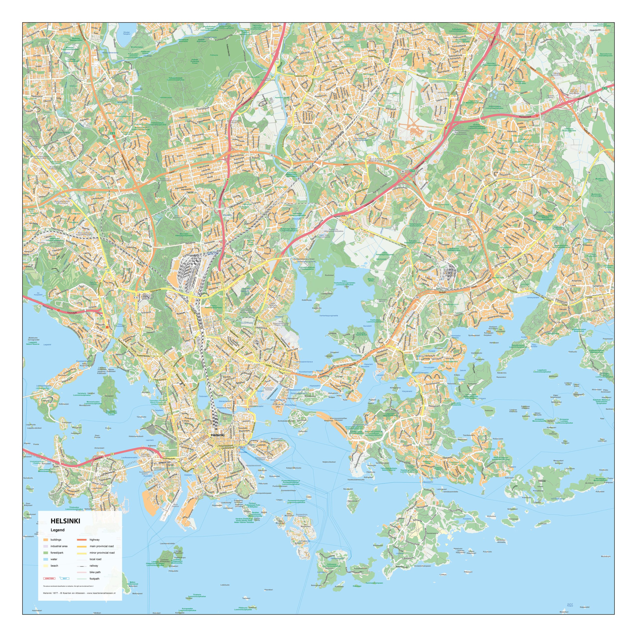 Deze gedetailleerde stadsplattegrond van Helsinki toont de Finse hoofdstad met haar overzichtelijke stratenpatroon, kustlijn en kenmerkende eilanden. Van het compacte centrum tot de omliggende woonwijken en havengebieden zijn straten, waterpartijen en groene zones helder weergegeven. De kaart is beschikbaar als wandkaart of digitaal bestand en biedt een mooi overzicht van deze open en ruimtelijke stad aan zee. Bekijk ook onze andere stadsplattegronden van Europese hoofdsteden.