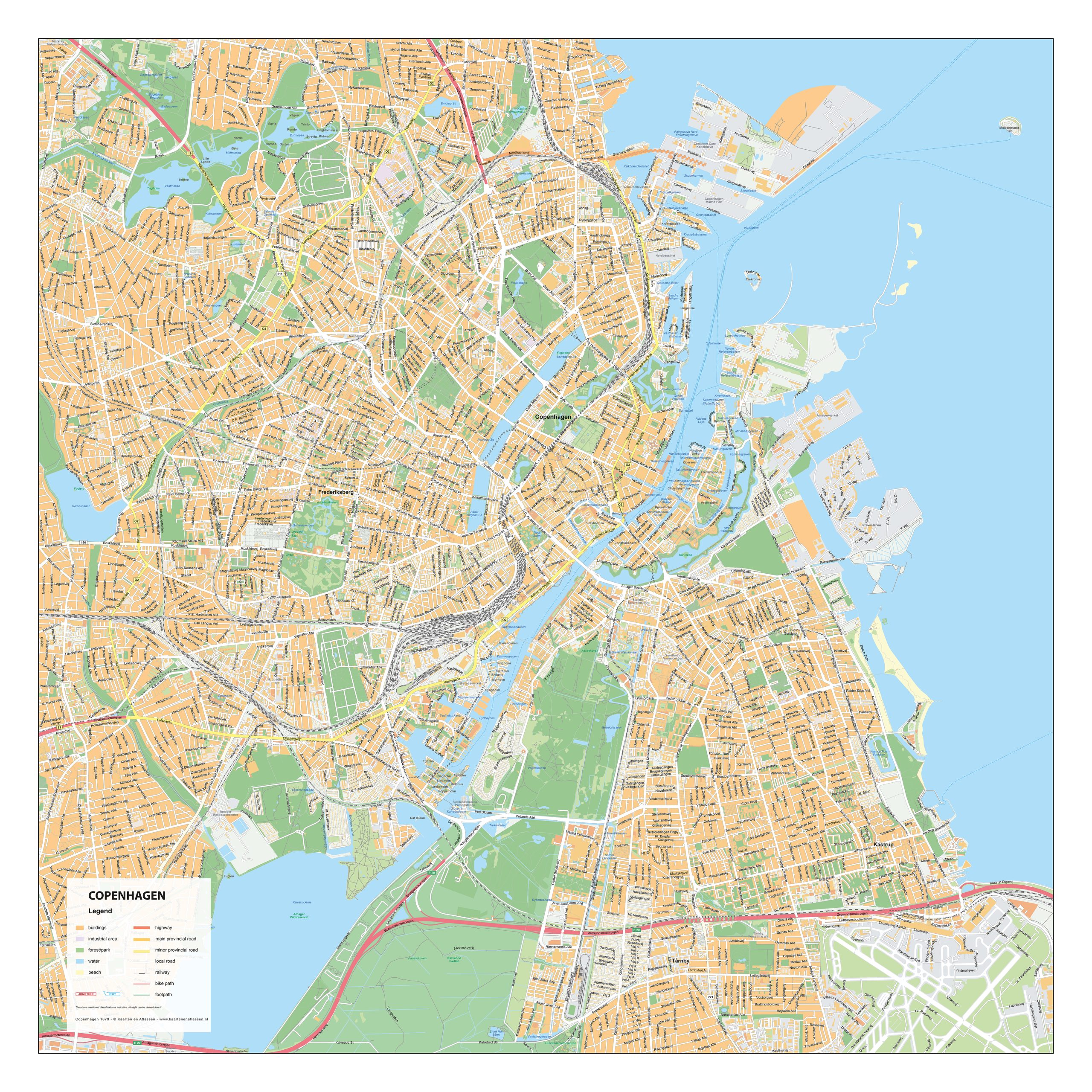 Deze gedetailleerde stadsplattegrond van Kopenhagen toont de Deense hoofdstad met haar historische binnenstad, havengebieden en herkenbare stadsstructuur. Van de wijken rond Nyhavn en Christianshavn tot de bredere stadsdelen eromheen zijn straten, waterpartijen en groene zones overzichtelijk weergegeven. De kaart is beschikbaar als wandkaart of digitaal bestand en biedt een mooi totaalbeeld van deze open en toegankelijke stad aan het water. Bekijk ook onze andere stadsplattegronden van Europese hoofdsteden.