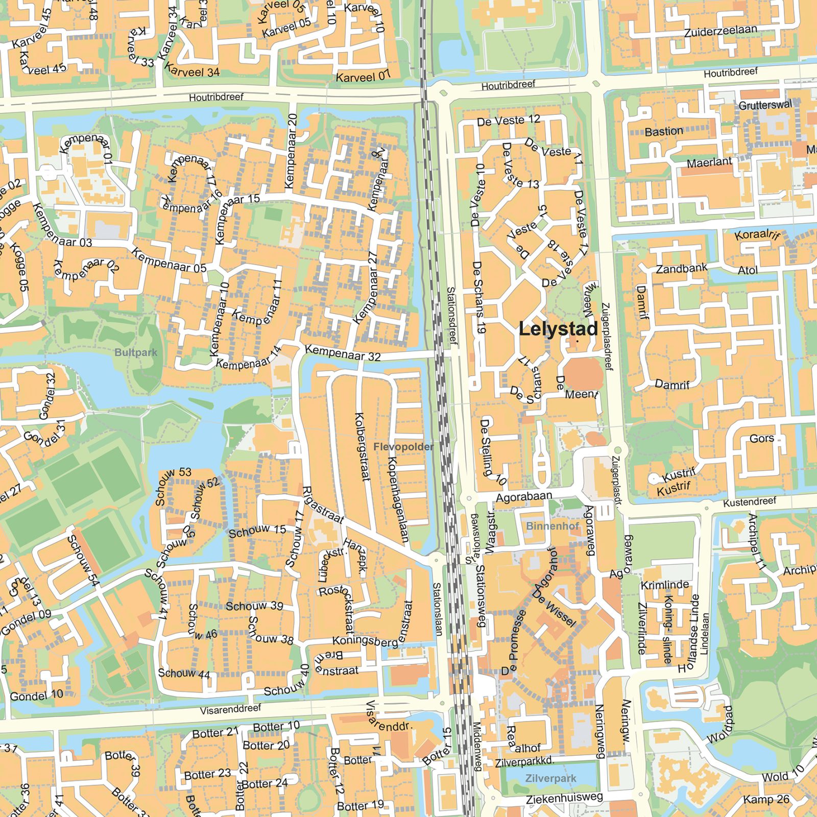 Deze gedetailleerde stedenkaart van Lelystad toont de moderne, ruim opgezette structuur van de stad. Van het centrum en de kenmerkende woonwijken tot de havengebieden en de uitgestrekte groenvoorzieningen. Alle straten, waterpartijen en stedelijke lijnen zijn duidelijk weergegeven. De kaart is beschikbaar als wandkaart of digitaal bestand en biedt een compleet overzicht van Lelystad. Bekijk ook onze andere stadsplattegronden van Nederland.