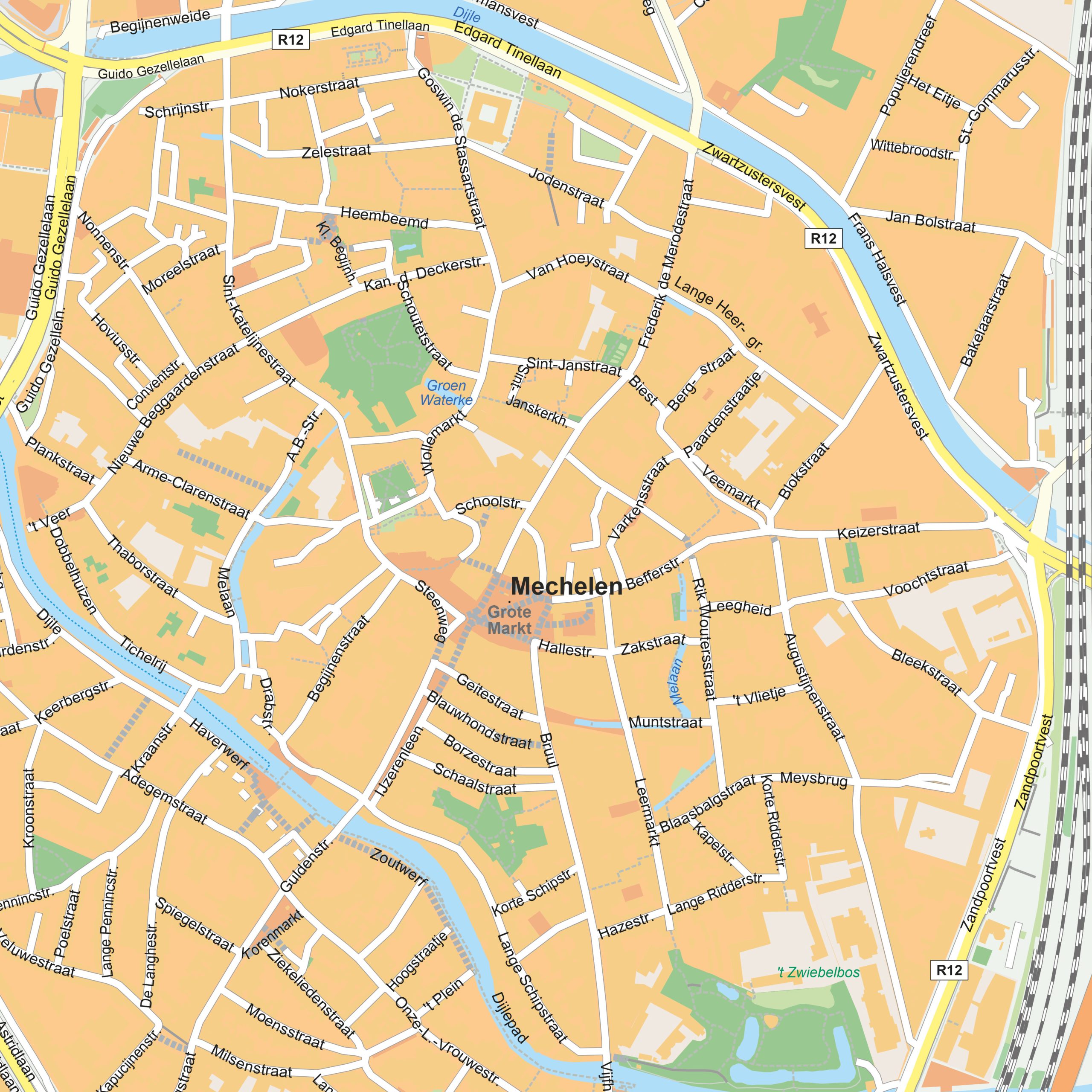 Deze stadsplattegrond van Mechelen geeft een duidelijk en volledig overzicht van de stad. Straten, waterlopen en groene gebieden zijn helder weergegeven in een verzorgde vormgeving. De kaart is beschikbaar als wandkaart en als digitaal bestand. Deze plattegrond van Mechelen laat zowel het centrum als de omliggende wijken overzichtelijk zien.