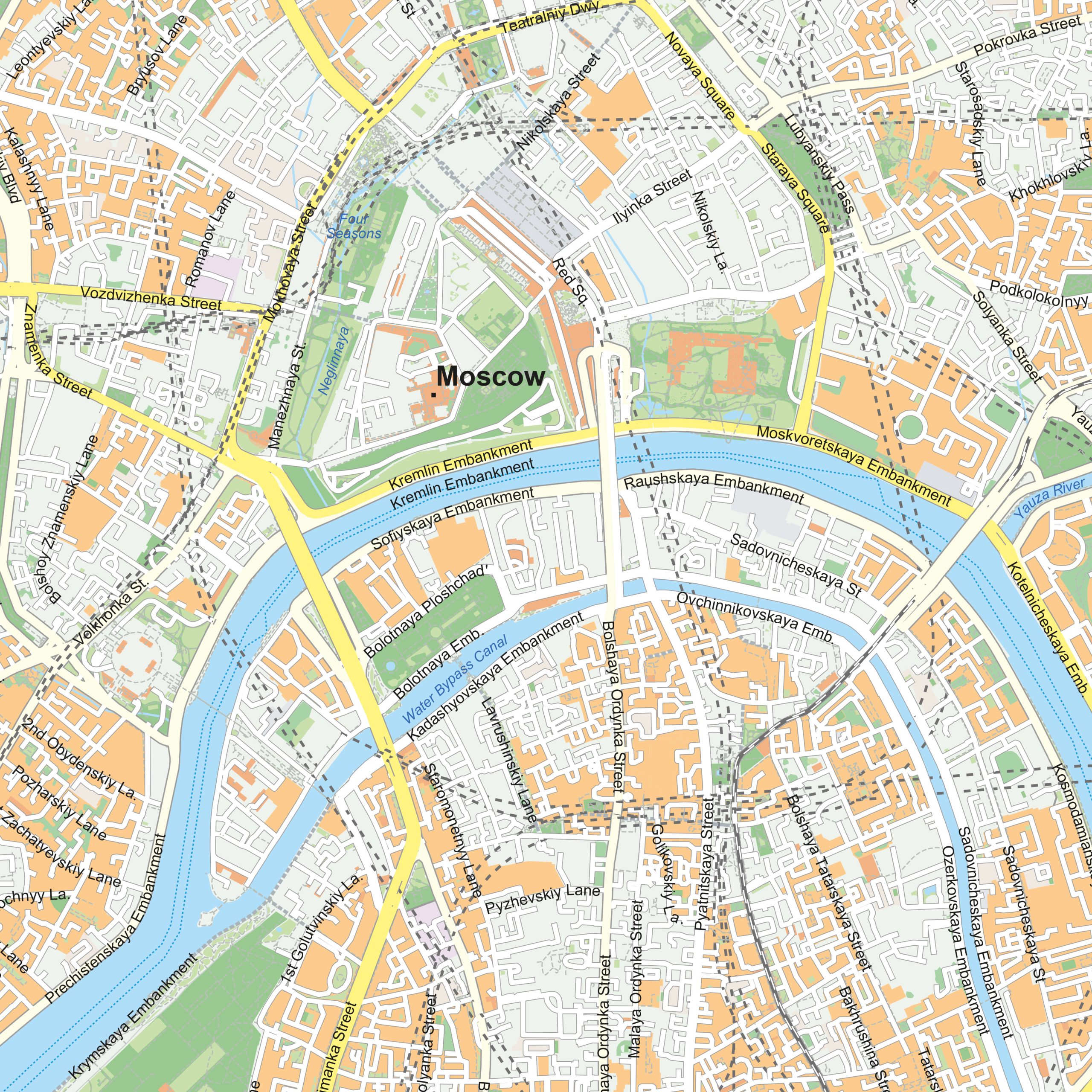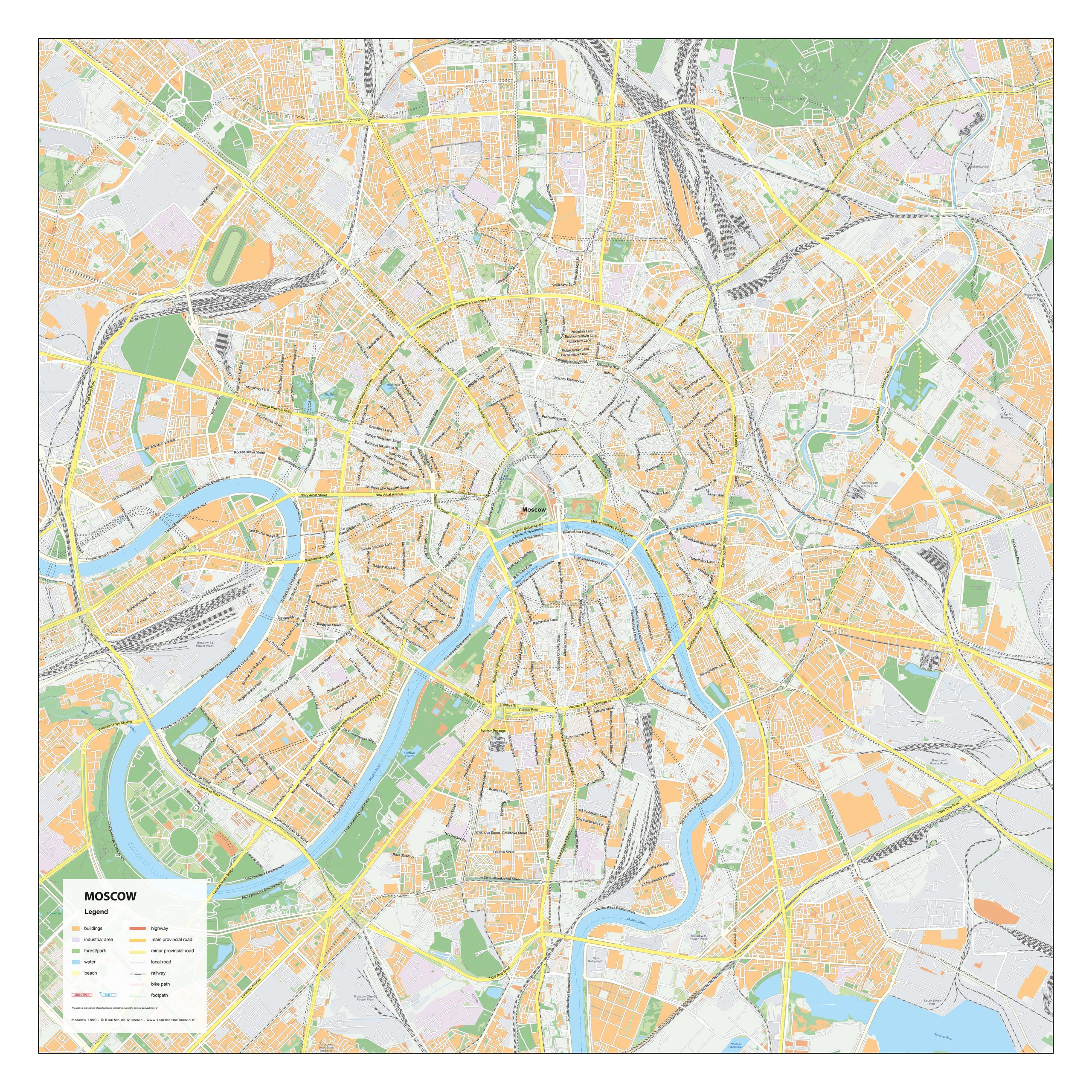 Deze gedetailleerde stadsplattegrond van het centrum van Moskou toont de historische binnenstad met het Kremlin, het Rode Plein en de omliggende wijken. Straten, parken en de rivier de Moskva zijn helder weergegeven. De kaart is beschikbaar als wandkaart of digitaal bestand en geeft een duidelijk overzicht van het hart van de Russische hoofdstad. Ook hebben we een grotere uitvoering van Moskou met omliggende gebieden.