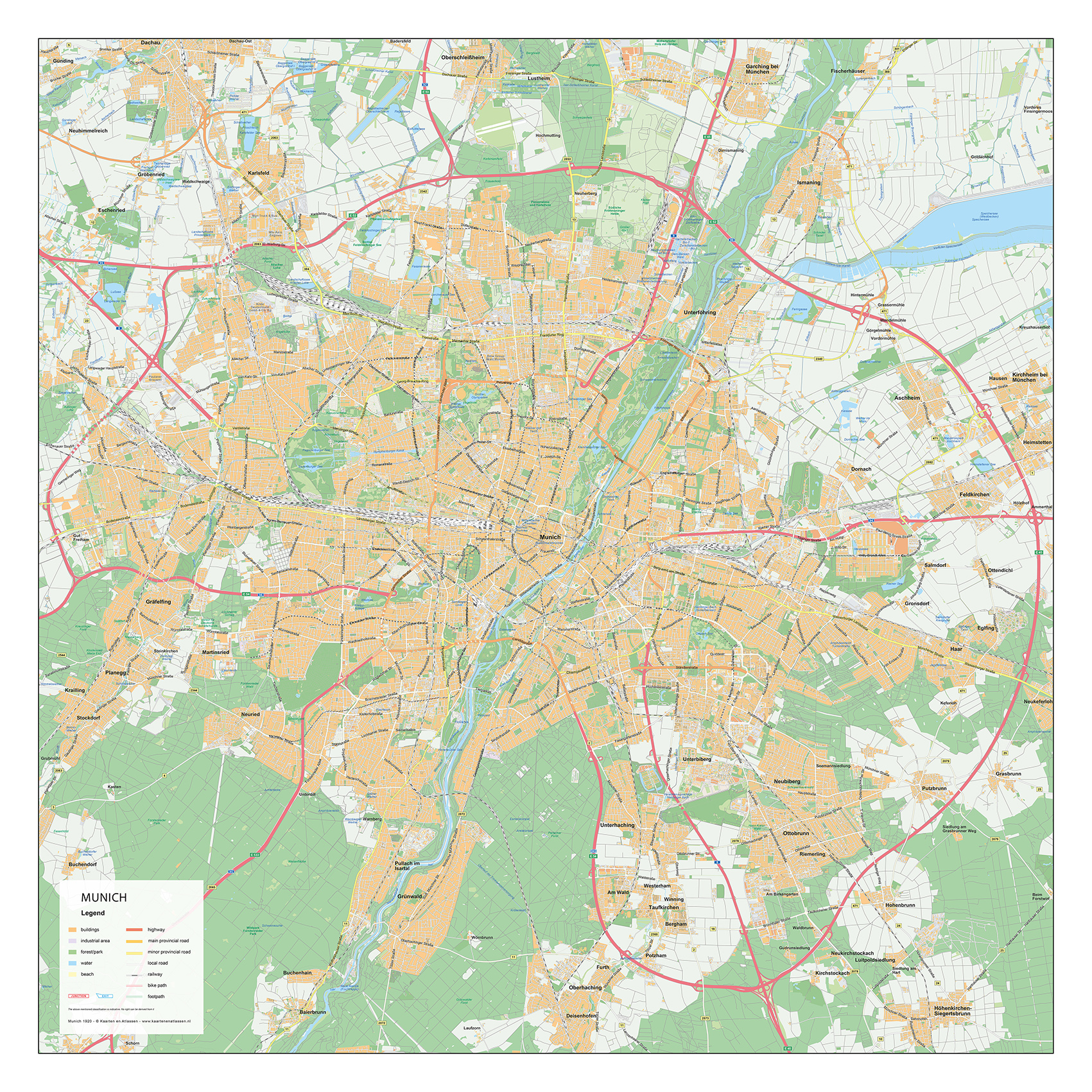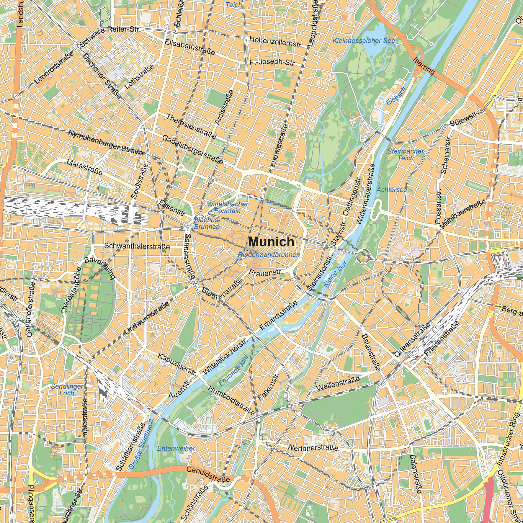 Deze gedetailleerde stadsplattegrond van München toont de Beierse hoofdstad in al haar verscheidenheid: van de Altstadt met Marienplatz tot de wijken Schwabing, Haidhausen en Glockenbachviertel. Straten, waterlopen, stadsparken en pleinen zijn helder en overzichtelijk weergegeven. De kaart is beschikbaar als wandkaart of digitaal bestand en laat München zien als een stad met een sterke structuur, historische lagen en groene ruimte. Bekijk ook onze andere stadsplattegronden van Duitsland.