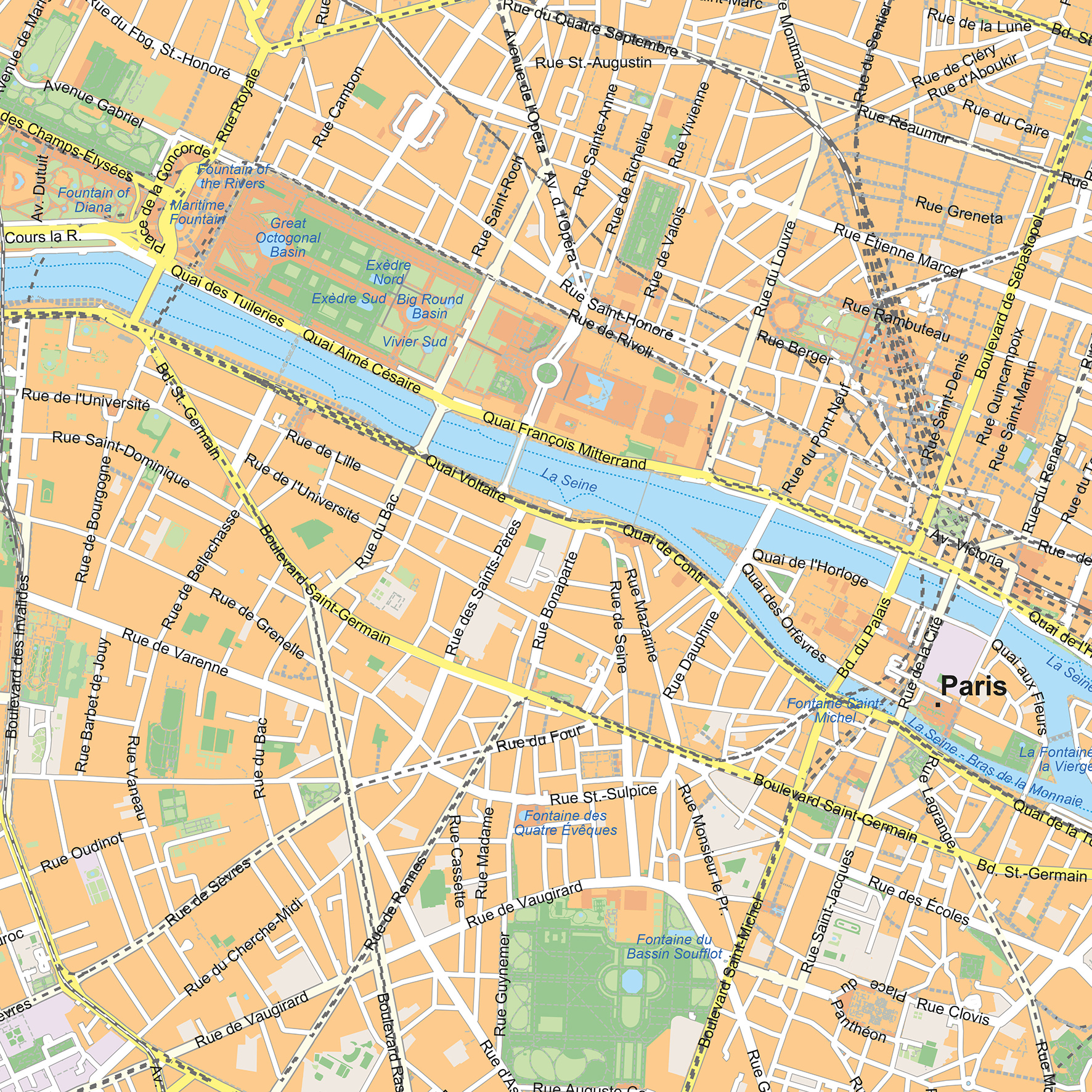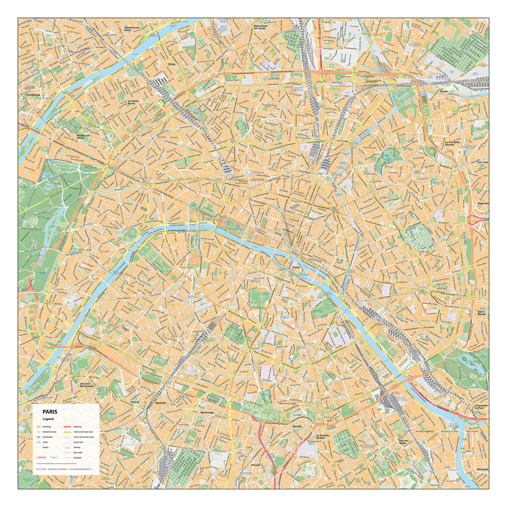 Deze gedetailleerde stadsplattegrond van Parijs toont het centrale deel van de stad, met bekende wijken zoals Le Marais, Saint-Germain en het Quartier Latin. De rivier de Seine, belangrijke boulevards en parken zoals de Jardin du Luxembourg zijn helder weergegeven. De kaart is beschikbaar als wandkaart of digitaal bestand en biedt een duidelijk overzicht van het historische en levendige hart van de Franse hoofdstad. Ook hebben we een grotere uitvoering van Parijs met omliggende gebieden.