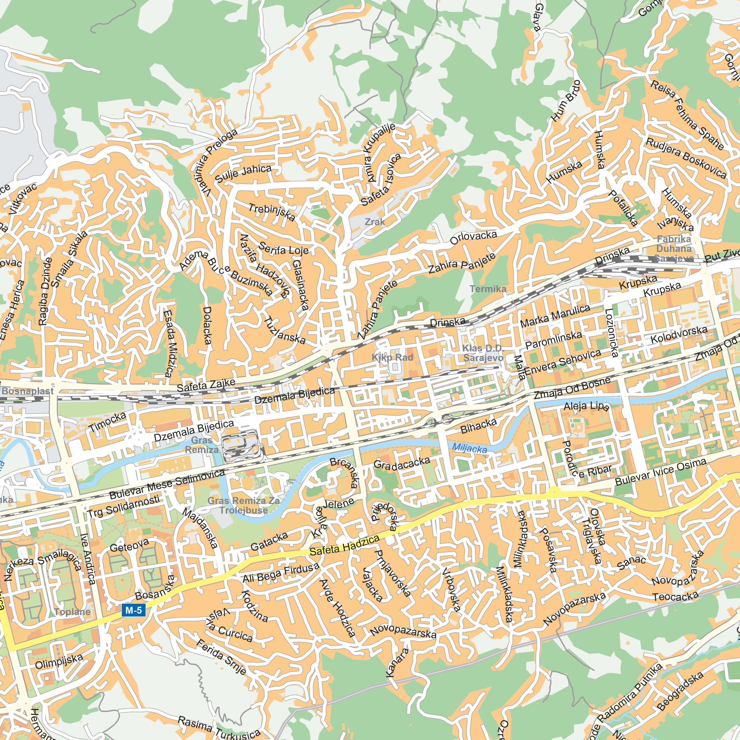 Deze stadsplattegrond van Sarajevo toont de Bosnische hoofdstad met haar historische binnenstad vol smalle straatjes, moskeeën en pleinen. De kaart laat ook de ligging van de rivier de Miljacka zien, evenals de omliggende heuvels en groene gebieden. Straten, bruggen en parken zijn helder weergegeven. De kaart is beschikbaar als wandkaart of digitaal bestand en biedt een compleet overzicht van deze culturele en historische stad. Bekijk ook onze andere stadsplattegronden van Europese hoofdsteden.