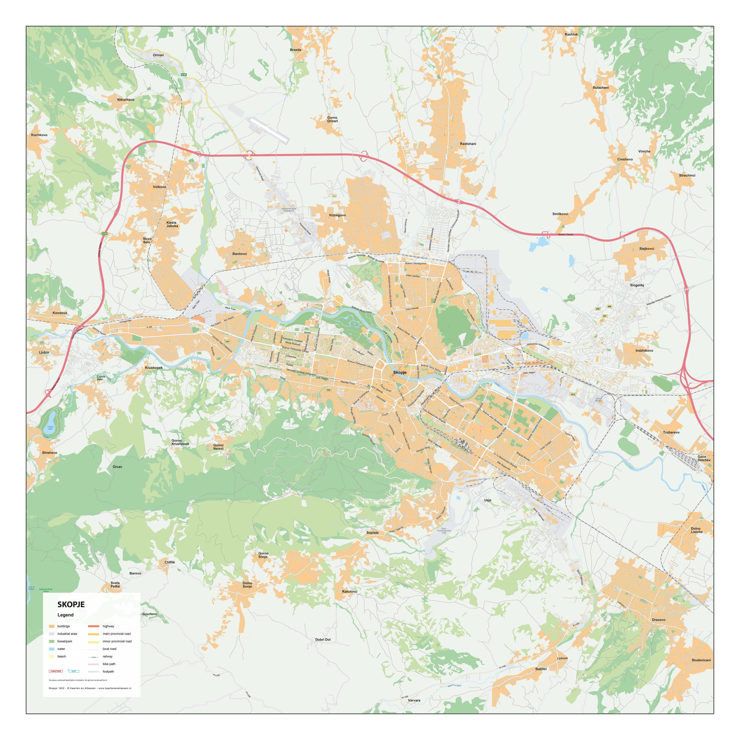 Deze stadsplattegrond van Skopje toont de Noord-Macedonische hoofdstad met haar bijzondere combinatie van historische wijken en moderne stadsdelen. De rivier de Vardar stroomt prominent door het centrum, omringd door pleinen, bruggen en groene zones. Straten en herkenbare gebouwen zijn duidelijk weergegeven. De kaart is beschikbaar als wandkaart of digitaal bestand en biedt een helder overzicht van deze veelzijdige stad. Bekijk ook onze andere stadsplattegronden van Europese hoofdsteden.